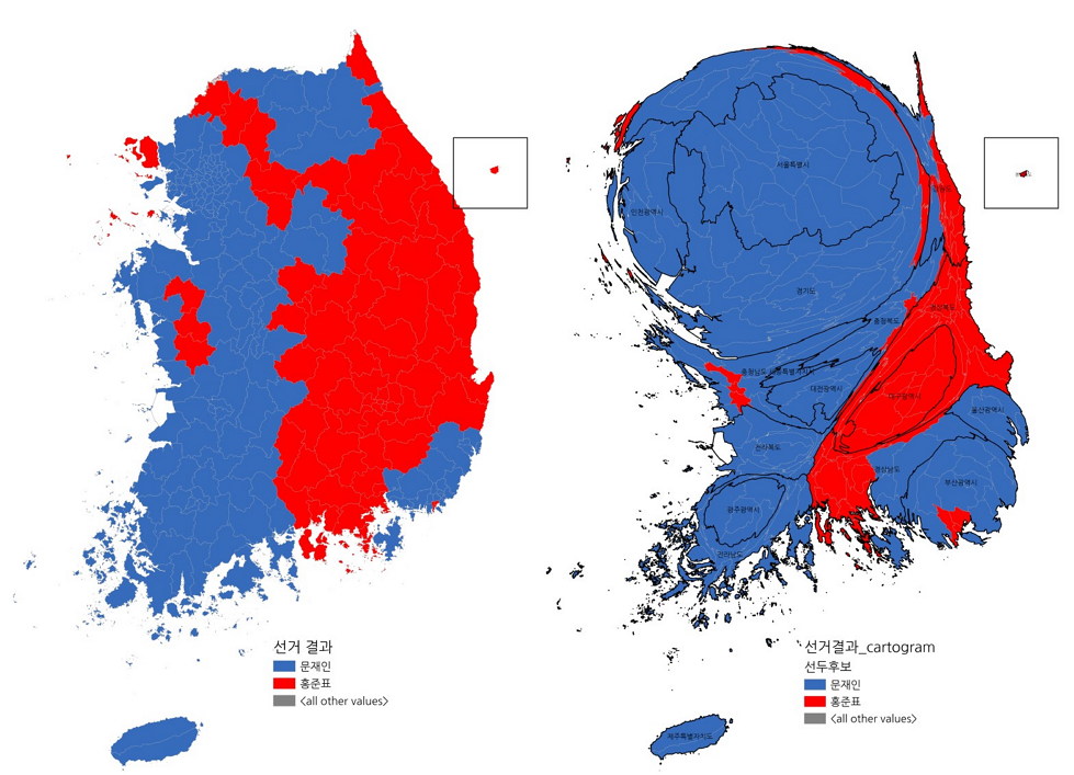 수원, 성남, 고양, 전주, 포항 등 250개 시군구 기준으로는 하위의 행정구들이 존재하는 지역들은 하나로 합쳐주었다. 원래 이렇게 하면 228개 기초자치단체가 되는데, 제주도의 경우 행정시인 제주시와 서귀포시를 별도로 구분해서 229개 시군구로 작업했다. 특별한 이유가 있는 것은 아니고... 하다보니 그렇게 되었다.