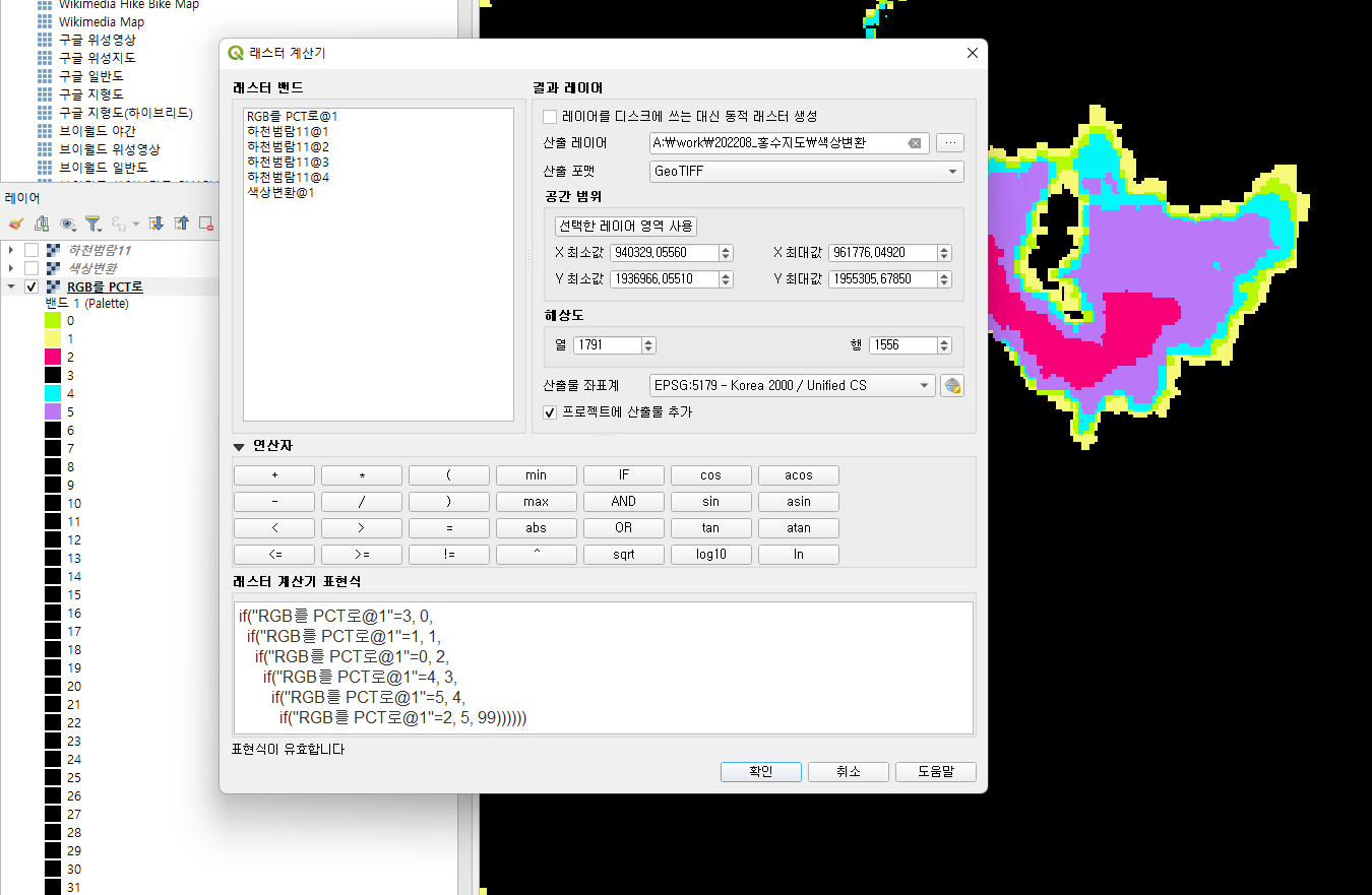 RGB to PCT 변환 직후에 '래스터 계산기' 창을 연다.