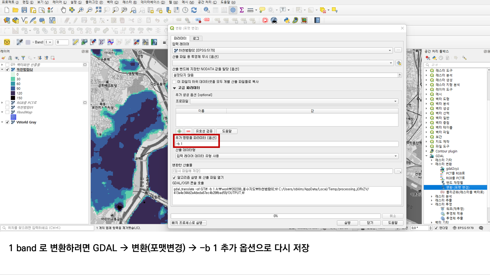 그냥 이용해도 상관없지만 그레이 스케일의 1band로 변환하려면 GDAL의 '변환(포맷변경)' 기능을 찾은 후, 위와 같이 추가 명령줄에 -b 1을 써넣어서 변환할 수 있다.