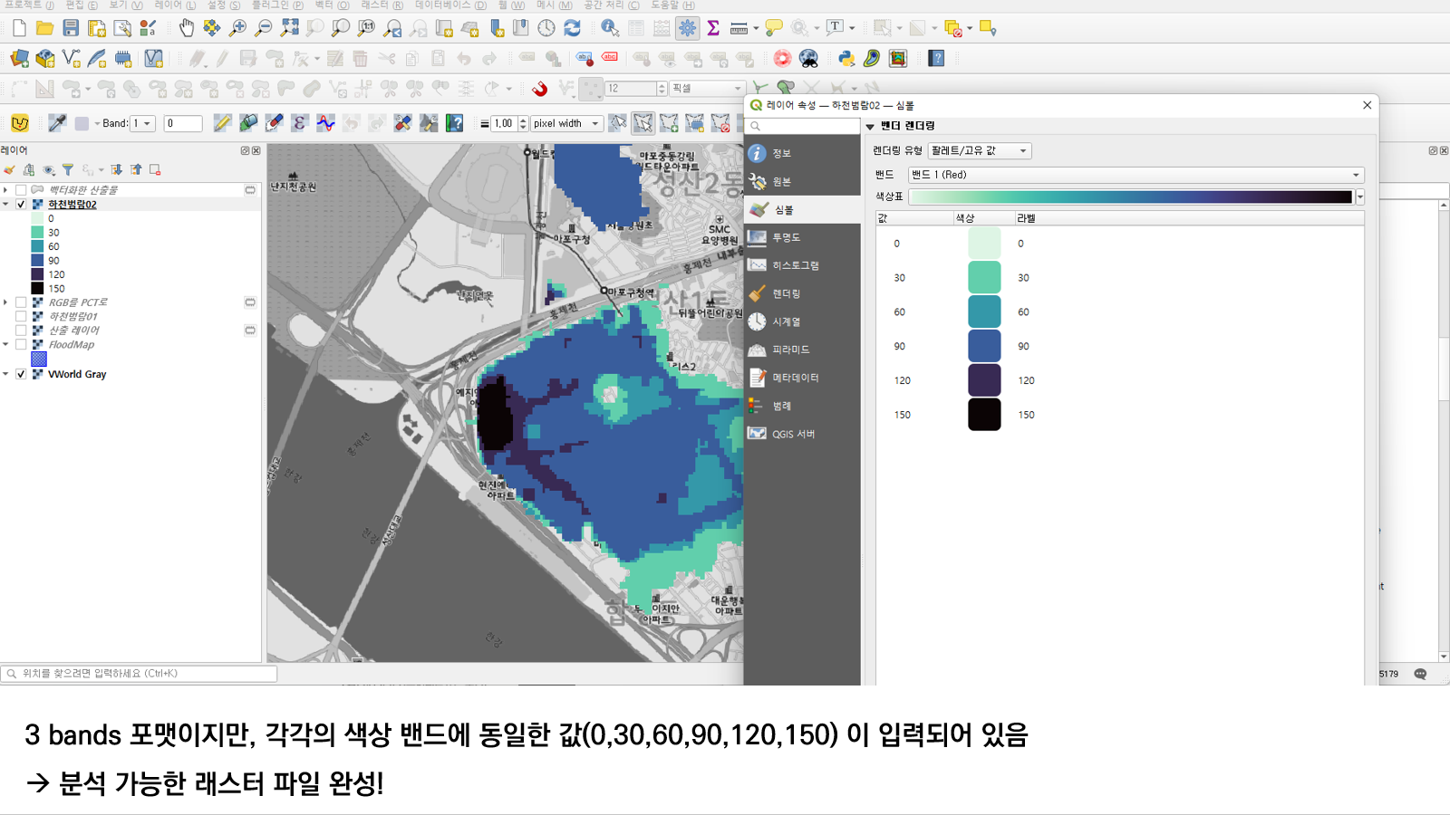 그래서 일부 변환해보면 위처럼 변환된다. 보이는 것은 배경지도와 당연히 똑같다. 그렇지만 이제 분석이 가능한 래스터 레이어가 되었다.