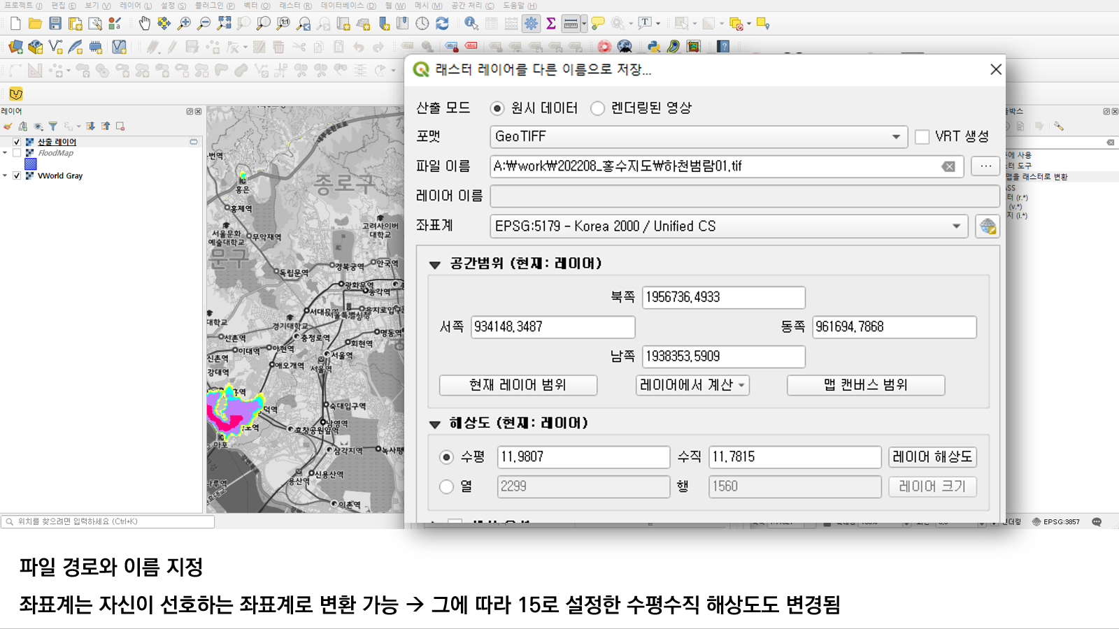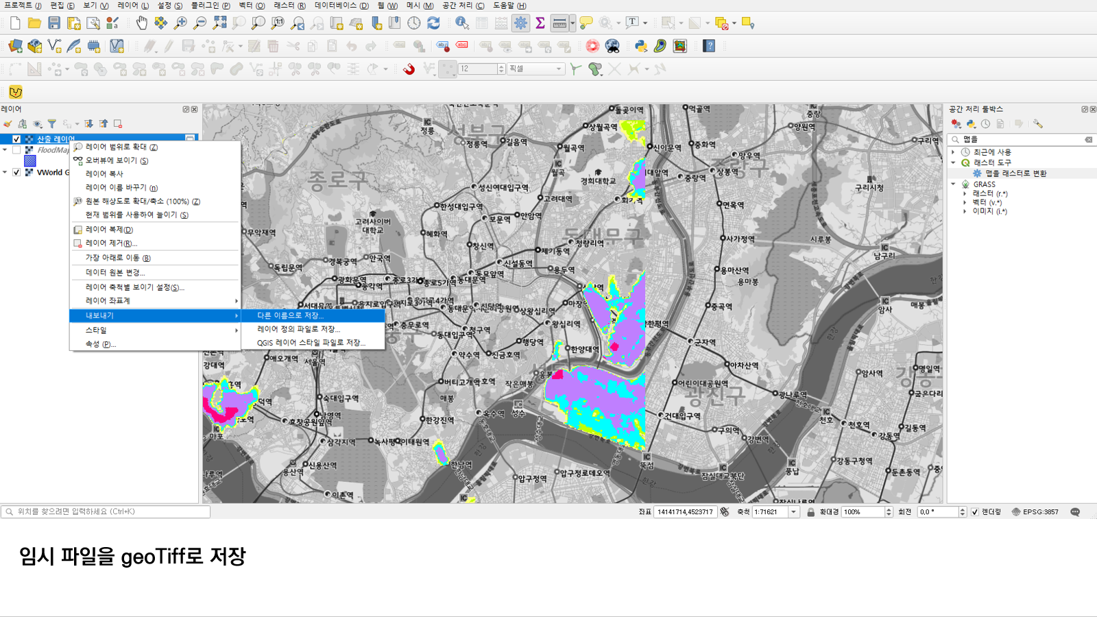 현재 행안부에서 서비스되고 있는 생활안전지도 중 하천범람지도를 QGIS에서 읽어들이고, 래스터와 벡터 형식의 파일로 변환 및 저장하는 방법을 다루었습니다.