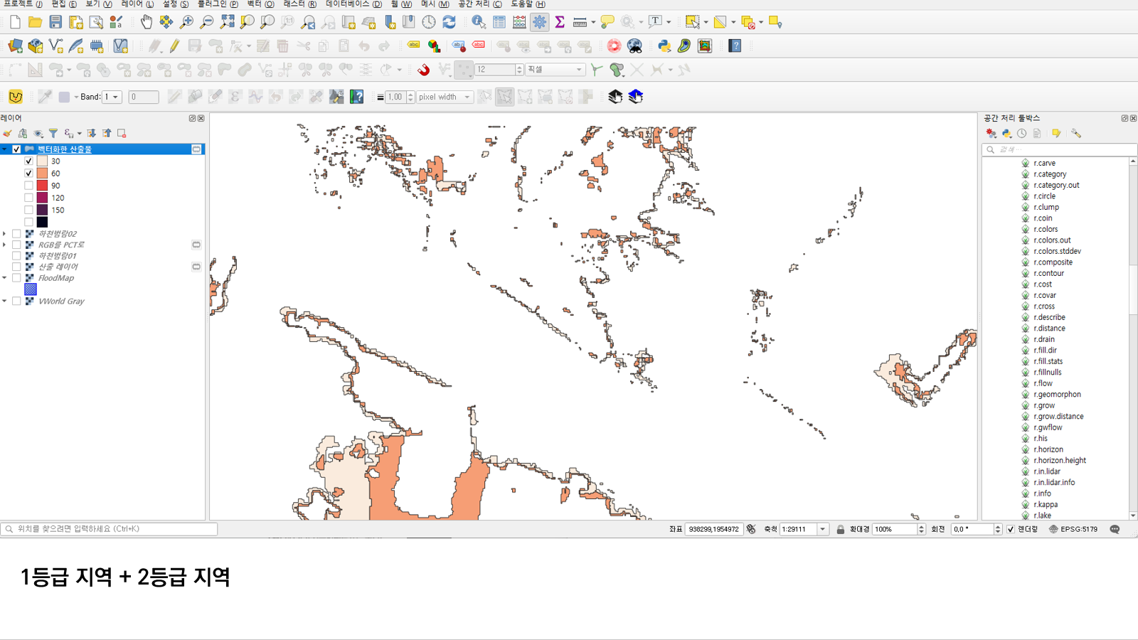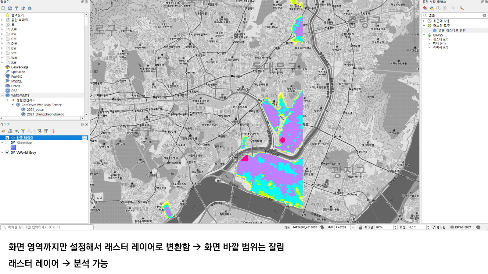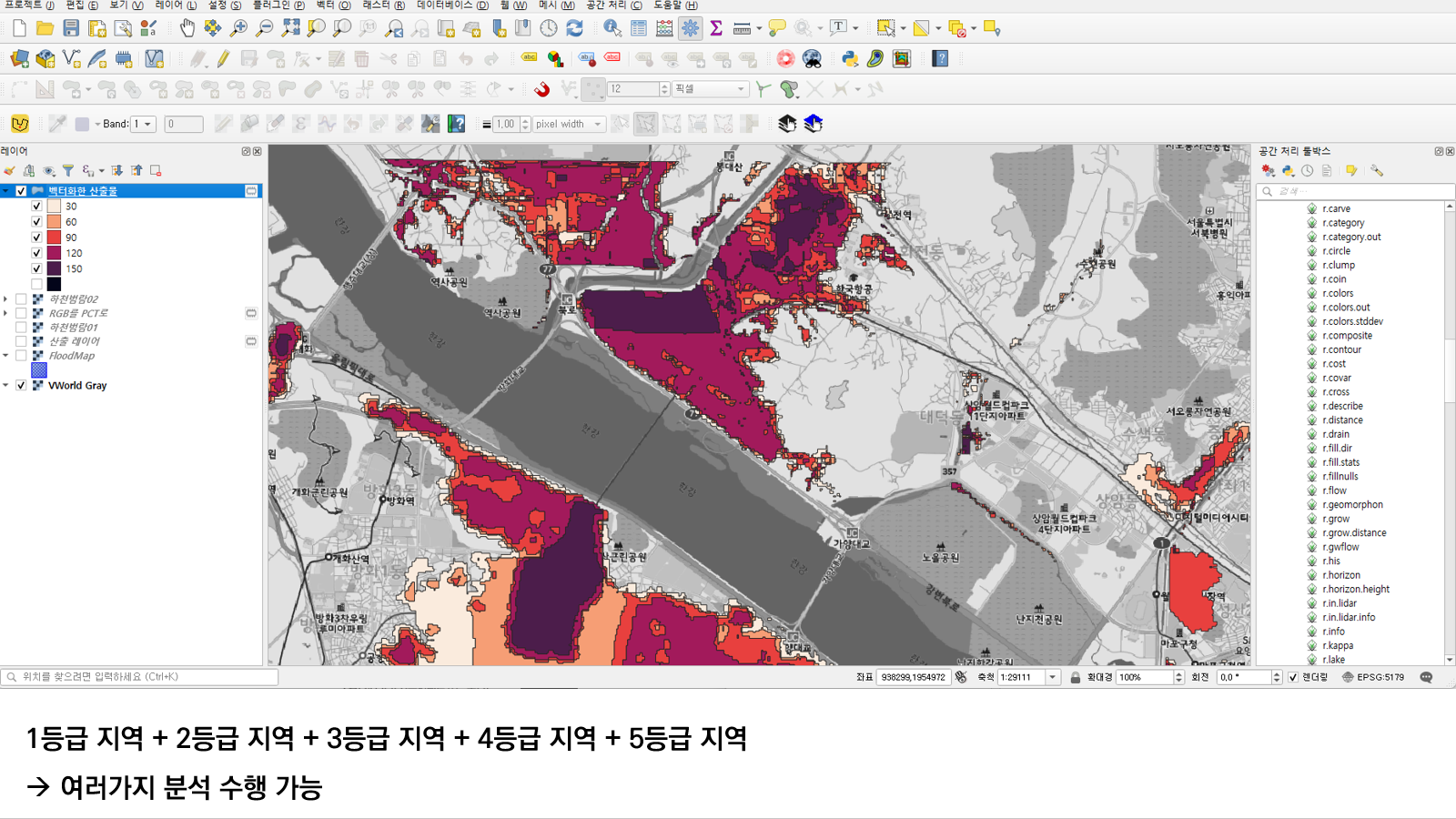벡터 레이어와 래스터 레이어로 모두 변환했으므로 이제 여러가지 분석작업에 이용할 수 있다.