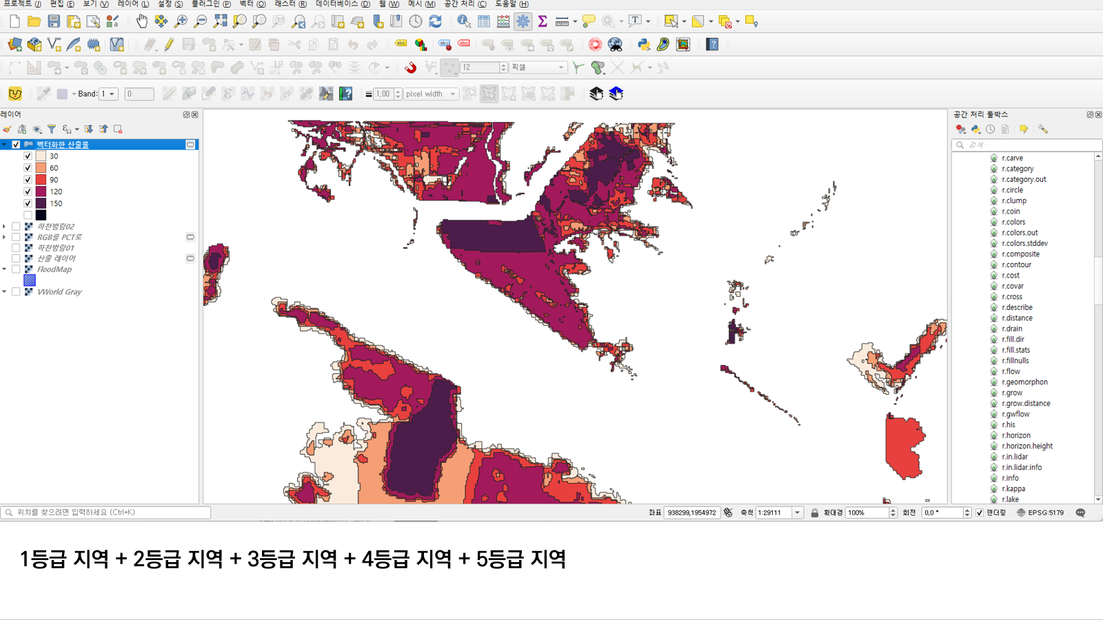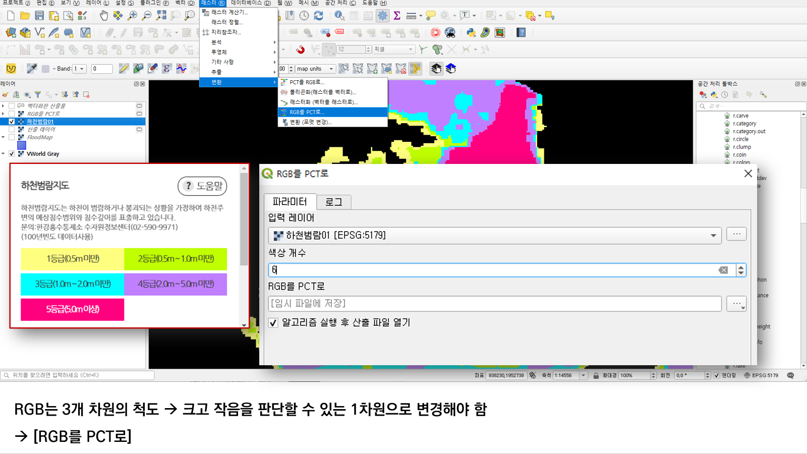 래스터 분석에 이용하려면 지도에 부여된 1등급~5등급이 1차원의 척도로 구분되어 있어야 한다. 그런데 현재 변환된 지도는 RGB 값을 모두 갖고 있고, R, G, B 각각의 차원에서 1등급~5등급이 순서대로 구분되어 있지 않고 엉켜 있으므로 그 정리 작업을 해줘야 한다.