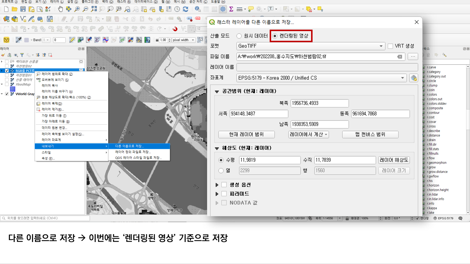 똑같이 GeoTIFF로 저장하는데, 이번에는 렌더링된 영상으로 옵션을 바꾼다. 즉, 화면에 보이는 색상대로 저장할 수 있다.