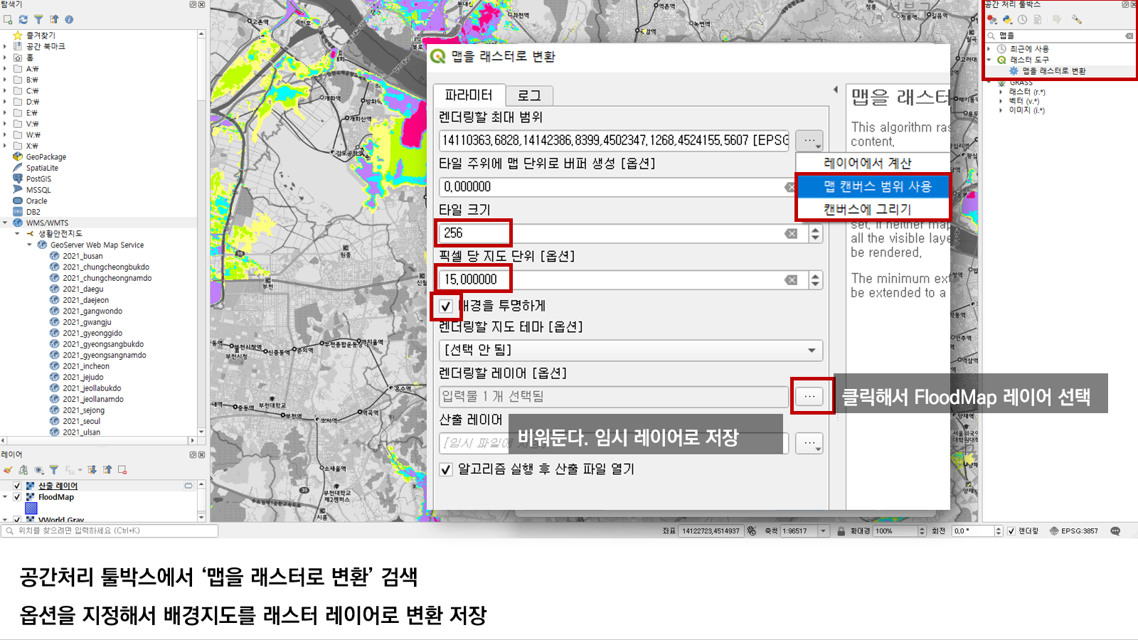 '맵을 래스터로 변환' 기능을 찾아서 위와 같은 셋팅으로 변환한다.
