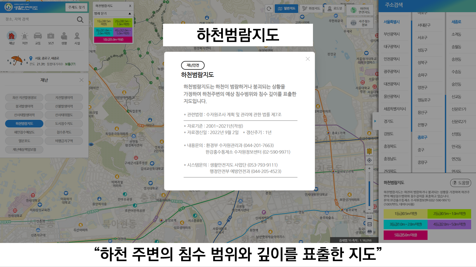 침수와 관련된 지도를 찾다가 행안부에서 서비스하는 생활안전지도 중 하천범람지도를 알게 되었다. 원래는 환경부에서 직접 서비스하다가 최근에 행안부의 생활안전지도 하위 카테고리로 이관되었다.