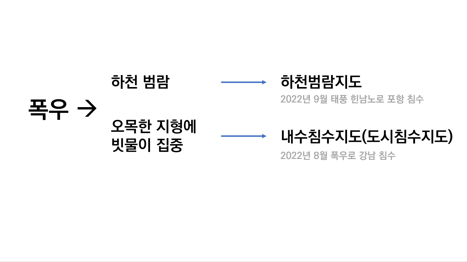 폭우와 관련된 지도는 두 종류다. 하천이 범람하거나, 배수용량보다 많은 빗물이 시간당 유입되어 침수되는 내수침수로 구분된다. 내수침수는 주로 주변보다 낮은 오목한 지형에서 많이 발생한다.