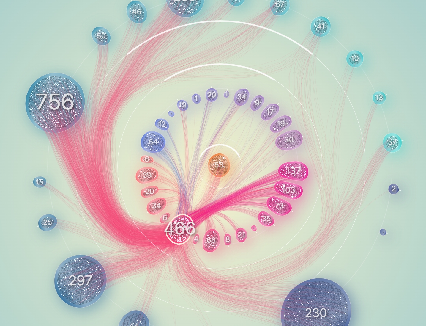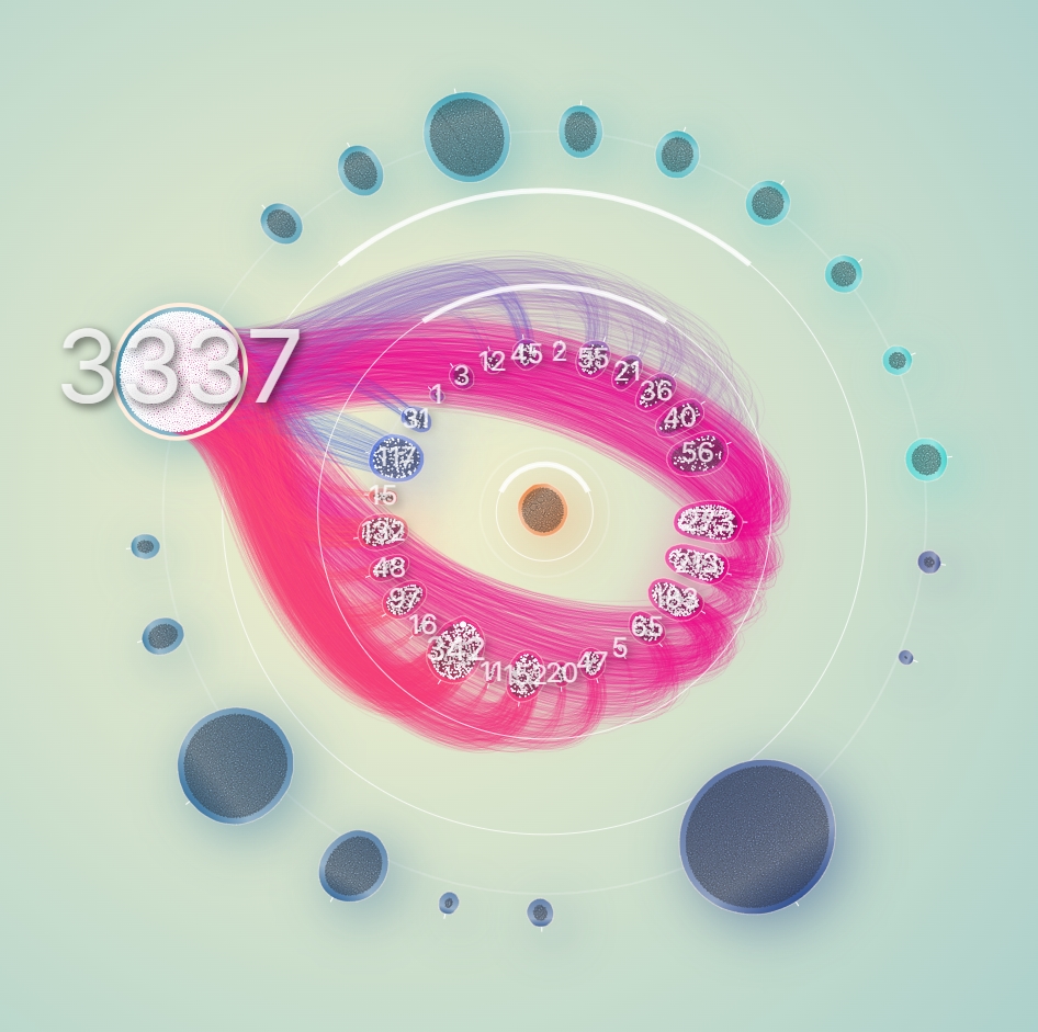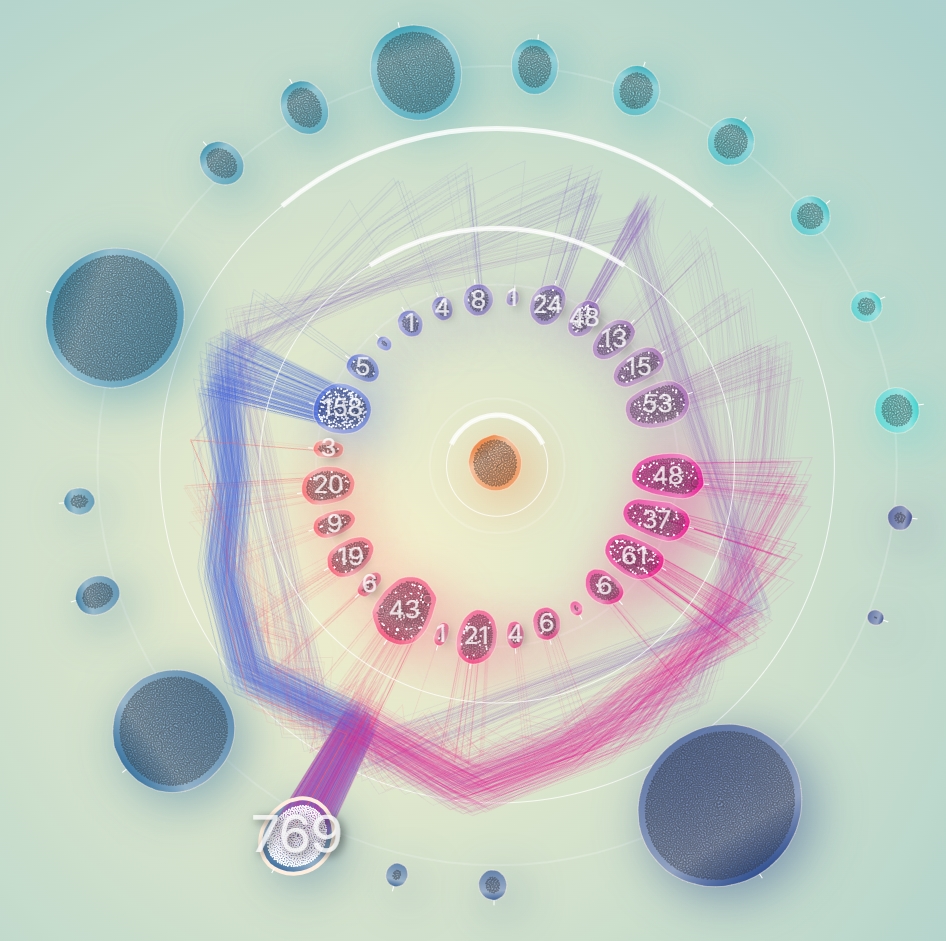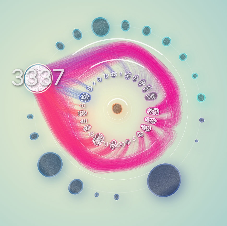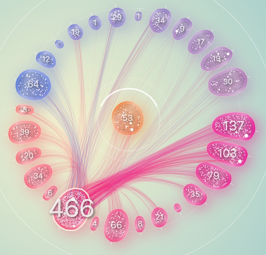 그래서 일단 노드들을 계열과 그룹으로 구분해보기로 했다. 계열은 중심으로부터 떨어진 반지름으로 구분했으며, 하나의 원을 이루는 동일 계열들을 20여개의 그룹으로 분리해서 그룹 각각이 구심점을 갖도록 했다.