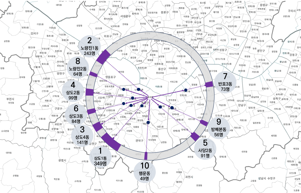 위의 예시는 흑석동에서 타 읍면동으로 전출한 경우 중 상위 10위까지를 표현하고 있다.