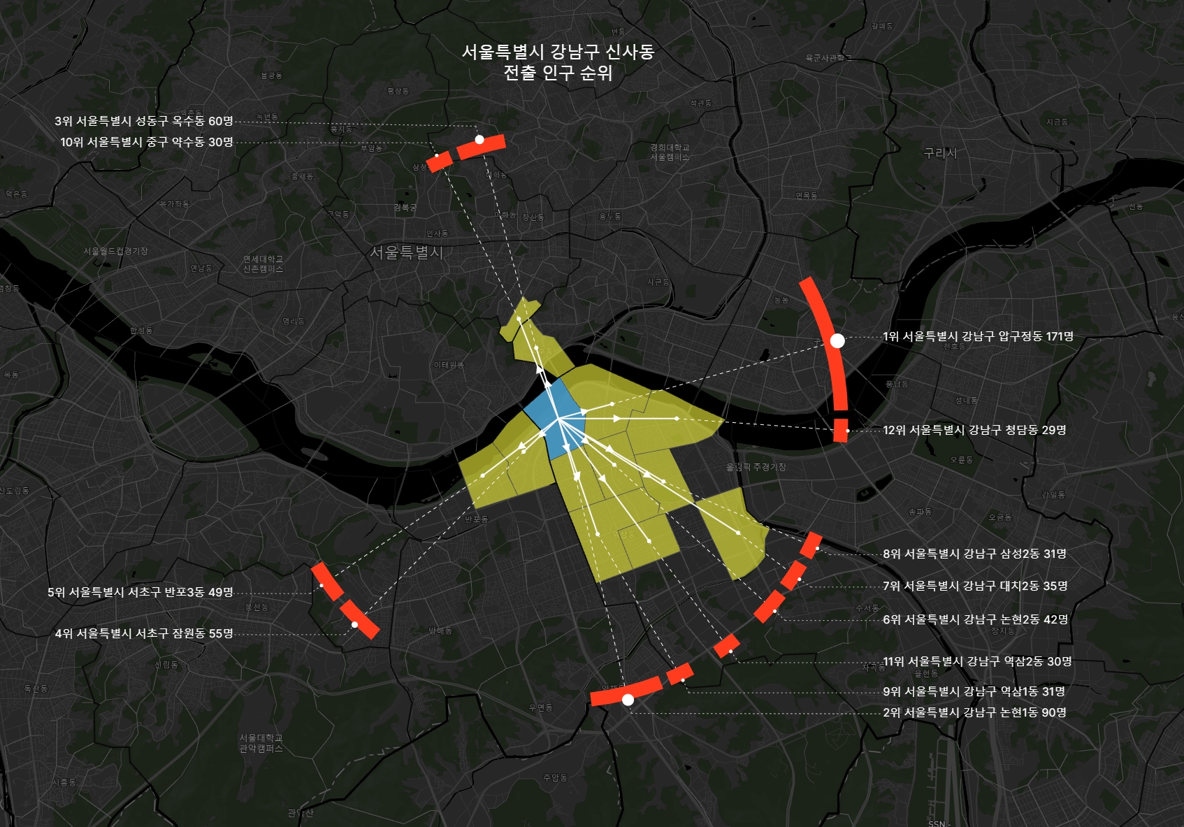 우선 도착지 읍면동 내부에 점을 하나씩 찍고, 출발지인 흑석동에서 실선 화살표로 연결했다.