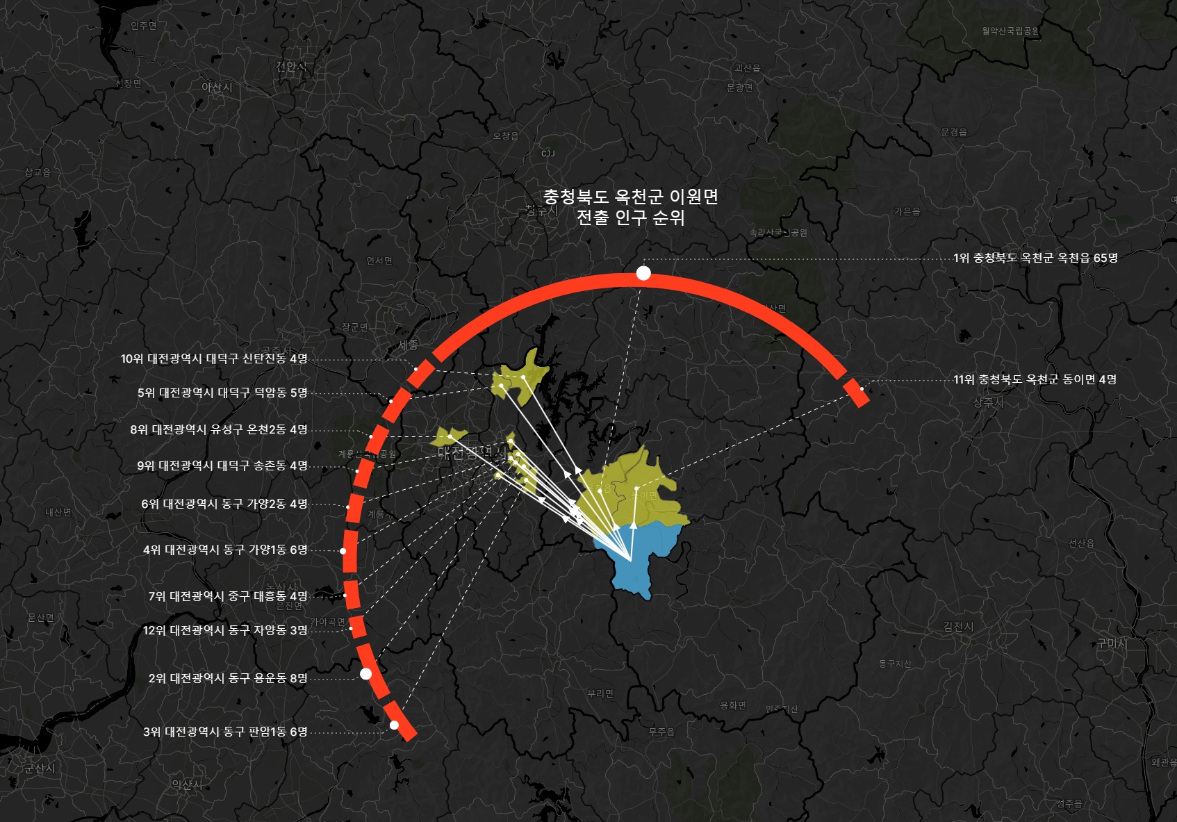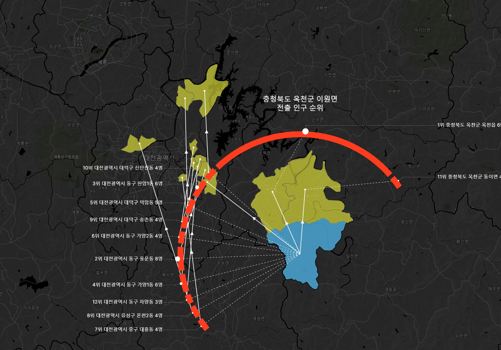 옥천군 이원면 같은 경우 옥천읍으로 65명 이동했는데, 2위~10위까지 모두 합한 것과 비슷한 정도다. 1위의 전출량 비중이 상당함을 쉽게 인지할 수 있다.