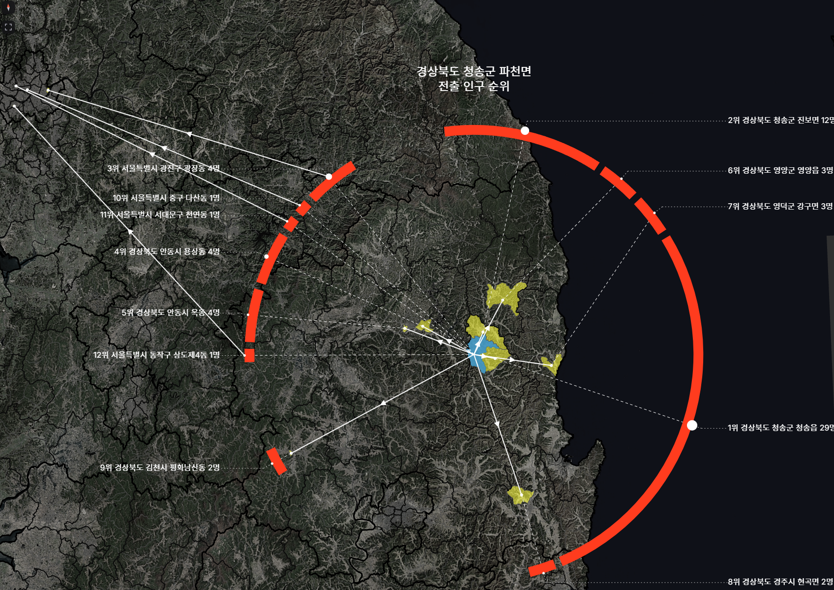 지역만 칠해놓고 보면 어디로 얼마만큼 이동했는지 알기 어렵지만, 환형의 표현을 덧대어보니 남측으로의 이동이 대다수임이 한 눈에 들어온다.