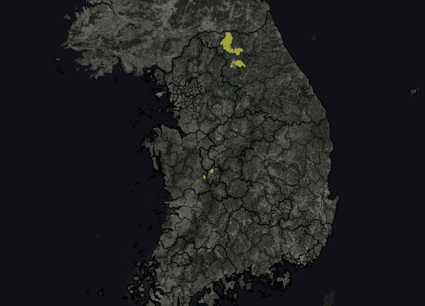 deck.gl로 읍면동 면에 색을 칠한 후 나머지는 svg 레이어를 위에 오버레이한 뒤, d3.js로 그렸다. viewState 변수에서 좌표값을 변경할 수 있는 project 함수등을 이용해서 지리 좌표와 스크린 상의 좌표들을 일치시켰다.