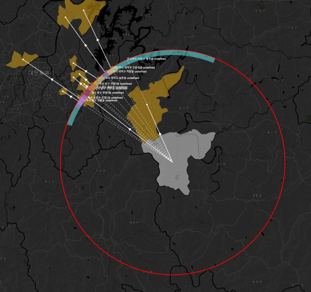 그리고 화면의 확대 축소 정도에 따라 10위 안의 지역들이 고리 바깥과 안쪽에 동시에 섞여서 위치할 경우들이 있었는데, 고리 바깥에 있을 경우에는 점선과 실선의 위치를 바꿔주었다. 즉, 고리 안쪽의 지역은 출발지~목적지를 실선, 목적지~고리까지를 점선으로 표현했는데, 고리 바깥의 경우에는 출발지~고리까지를 점선으로, 고리~목적지까지를 실선으로 표현했다.