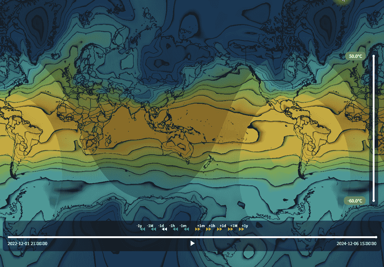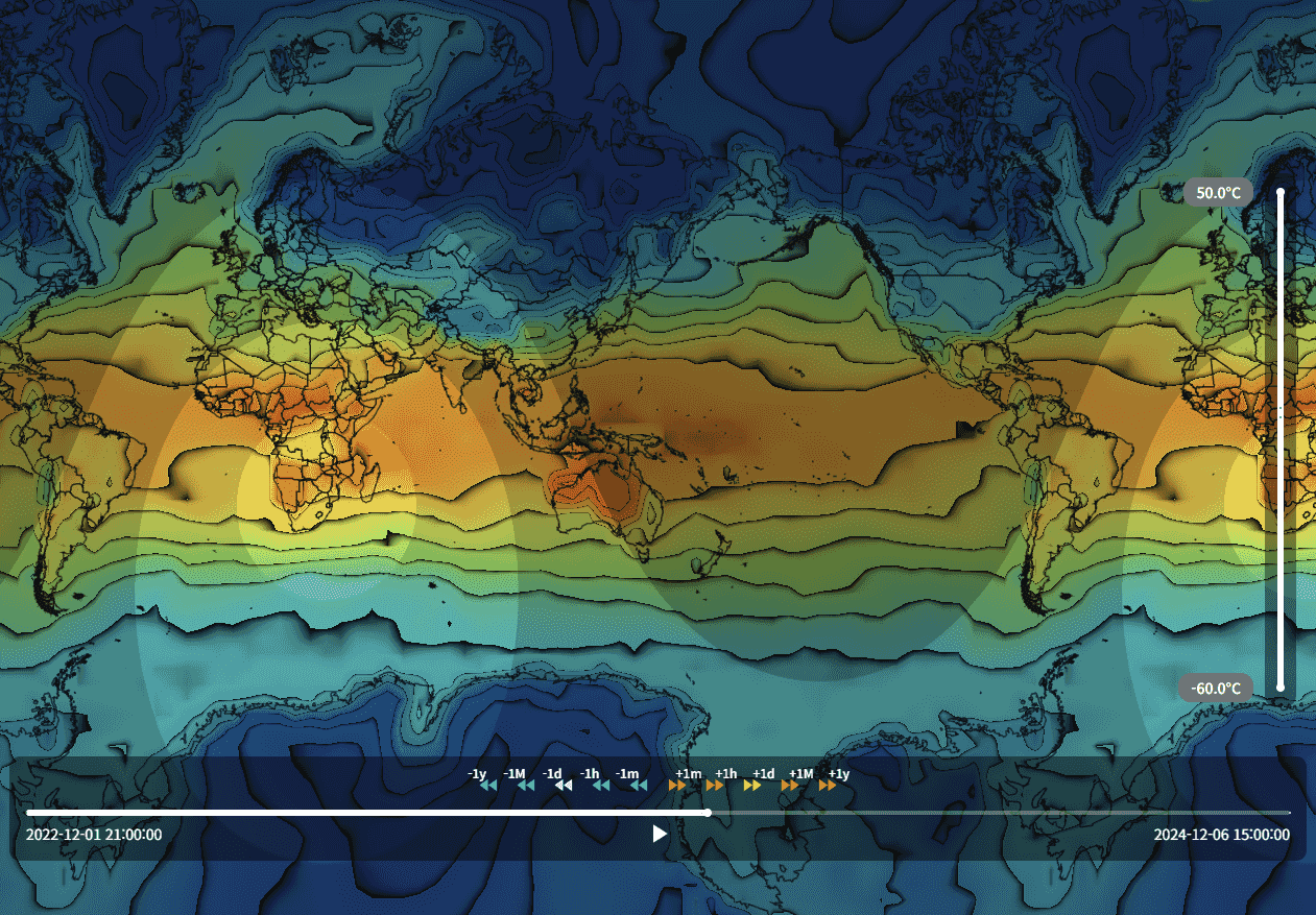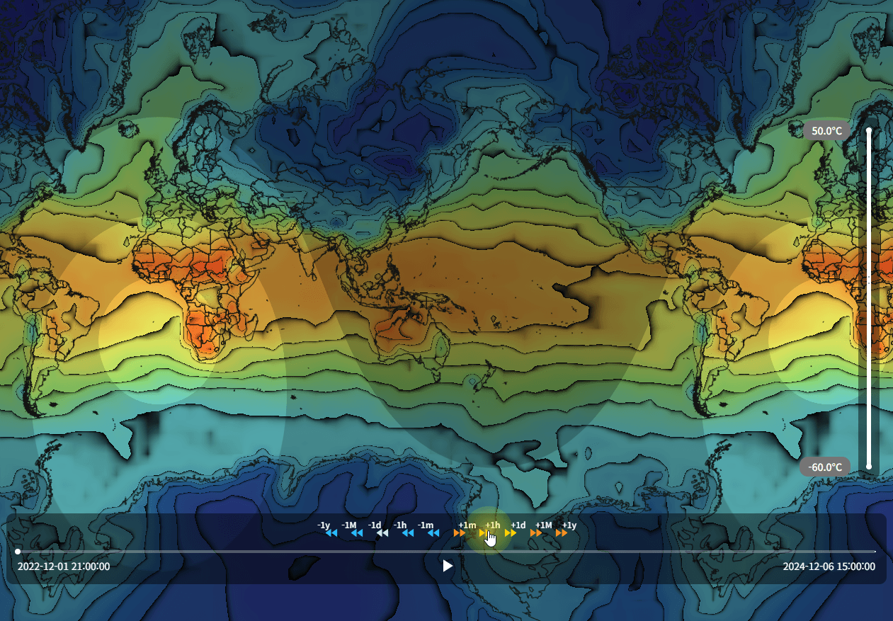 비슷해보이는 표현이라도 웹으로 구현하려고 하면 여러가지 제약이 따른다. 가장 첫 번째 제약은 데이터의 용량이다. 특정 시점에서화면에 그리는 데이터가 몇 MB를 넘어가버리게 되면, 아니, 1MB 정도라도 전송속도로 인해 끊김없이 보기에는 제약이 따른다. 물론 이런 상황에 대한 해법으로는 '타일맵'이라는 기술이 오래전에 나와 있다. 단, 이번에 한 '전 세계 기온 시각화' 작업에서는 시간 변화에 따라 3시간 간격의 원본 데이터를 자엽스럽게 이어서 보여주는 것을 목표로 했다.