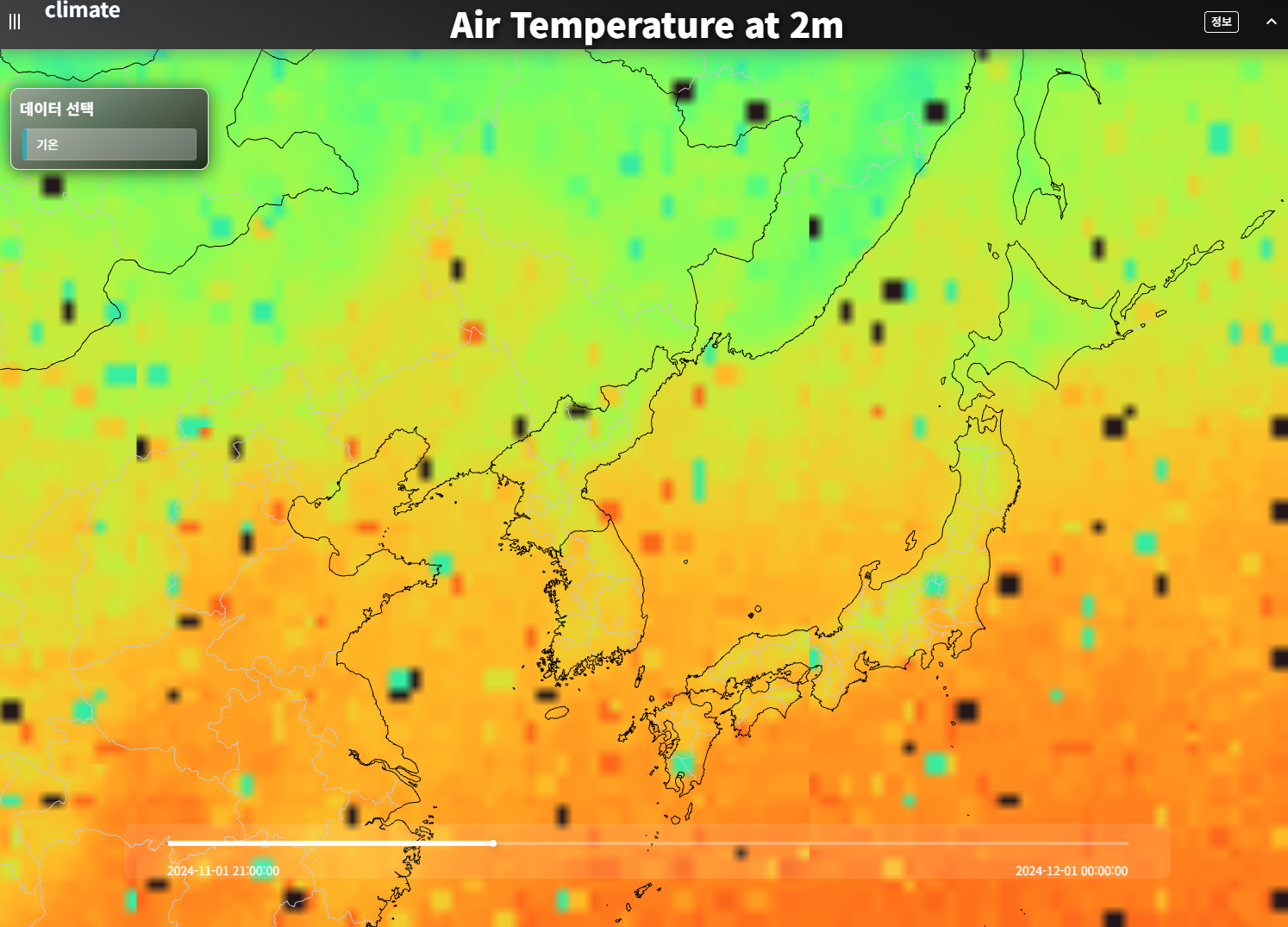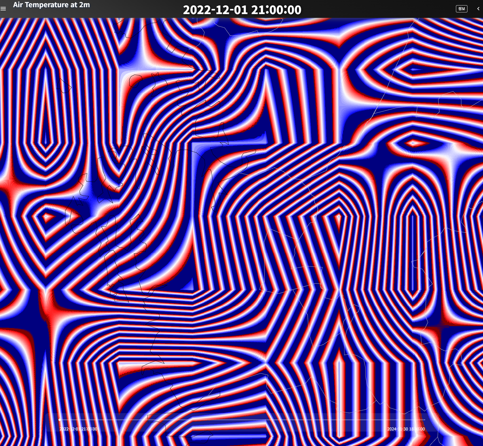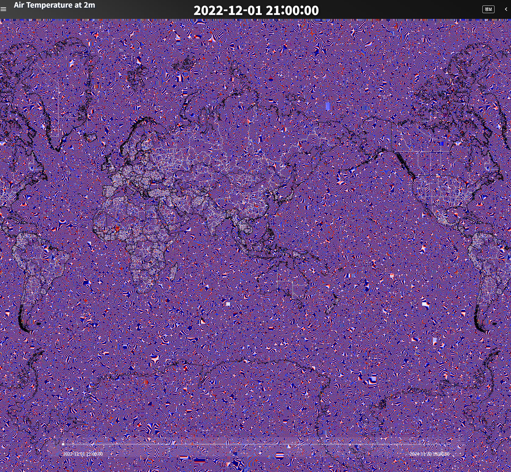 여기서 '기온'으로 통상적으로 사용하는 tmp2m(지표 2m 레벨 기온)을 사용했다. 데이터 다운로드 링크를 만들 수 있으므로 웹페이지상에서 최신의 데이터를 실시간으로 fetch 하는 것도 가능하지만, 시간 흐름에 따른 관찰이 어렵고 전송용량이 다소 커서 데이터를 미리 받아서 가공해두기로 했다.