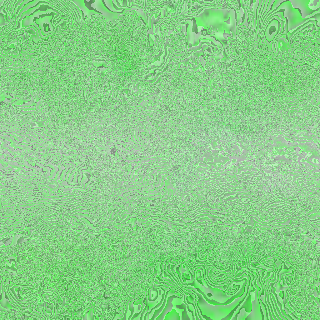 준비해놓은 RGB 텍스쳐를 셰이더에서 읽어서 보간했는데, 셰이더는 이미지를 확대할 경우 원본 텍스쳐 픽셀 각각의 채널에 대해 하드웨어적으로 보간함. 그런데 G 채널의 경우 현재시각의 소수점 부분 일부가 상위비트에, 다음시각의 정수 부분 일부가 하위비트에 섞인 채널이므로 이 채널이 보간되는 순간 값은 두 시점의 다른 스케일 데이터가 섞여서 값은 그냥 엉터리가 됨. 위 그림이 그 결과임