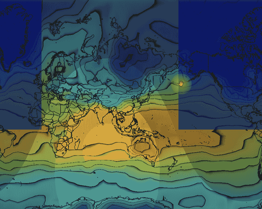 단점도 있다. 1단계까지 축소되면 전세계가 64x64 의 데이터로 표현되는데, 그만큼 해상도가 낮은 데이터 기반으로 보간을 하게 되므로 아래 그림처럼 축소 상태에서는 측정 지점의 기온이 변할 수 밖에 없다. 물론 넓은 시점에서의 기온 패턴이 변하는 것은 아니지만 국부적으로는 기온값이 틀린것처럼 보일 수 있다는 말이다.