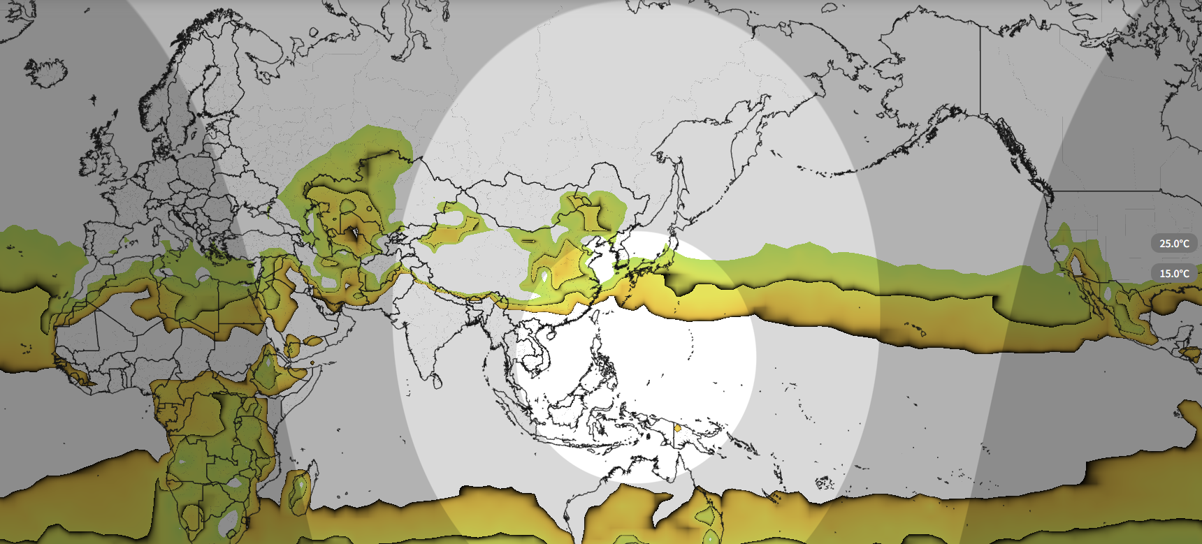 아래 그림에서는 태양 고도 60도 이상인 부분(가장 밝게 보이는 부분)과 기온이 상승하는 지역의 상관성을 직관적으로 관찰할 수 있다.