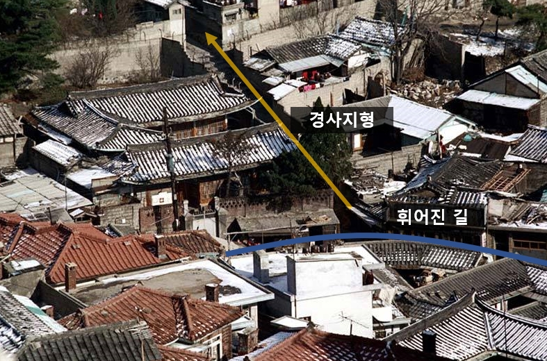 그림자 방향을 볼 때 서쪽에서 동쪽 정도를 본게 아닐까 생각했다. 다만, 사진에서 보이는 한옥이 어느정도 규모가 있으므로 지붕의 형태로 찾기 시작했다. 완곡하게 꺾이는 길이 있고, 그로부터 시작되는 경사지형이라는 점도 참고했다.