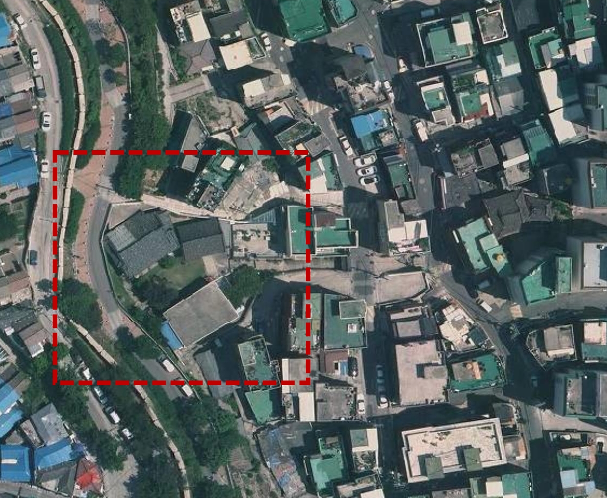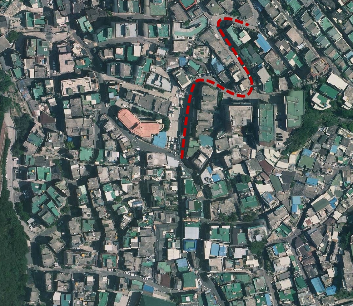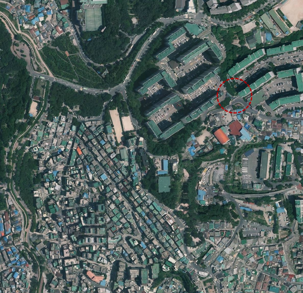 건물의 각도를 볼 때 아마 장수마을쪽 언덕에서 찍었을 것이라고 생각한다.