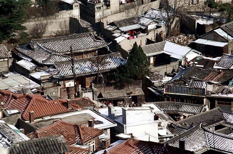 옛 기와집과 신형주황색 기와집. 아파트