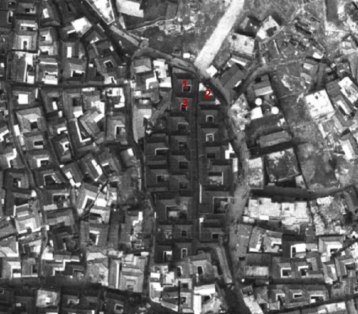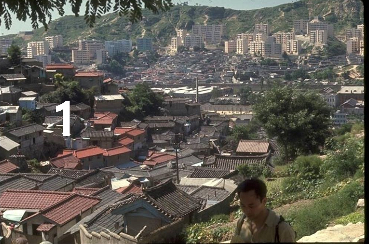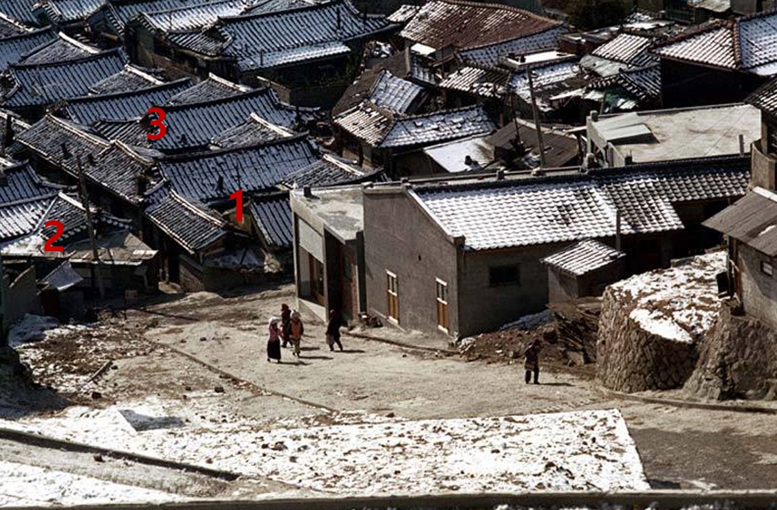 찾았다. 각각 1,2,3번의 지붕형태, 그리고 뒤쪽의 집들이 모두 일치한다. 한옥지붕보다 근거리에 있는 건물들은 항공사진에서 찾아보기 어렵다. 항공사진의 시기와 Nick Dewolf 사진의 시기가 약간 다른 것 같다.