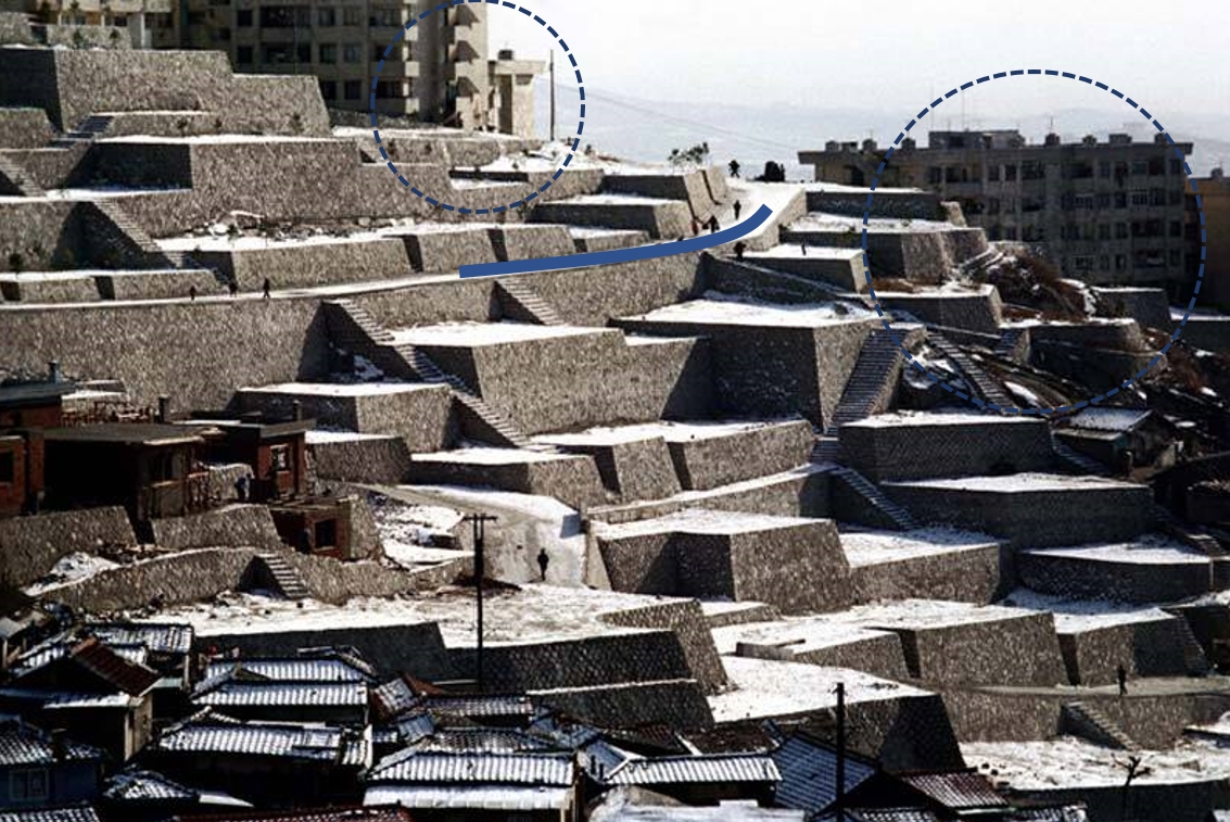 마치 지구라트 같아 보이는데, 우리나라에 지구라트는 없었으니.... 아마도 땅을 고르고 한꺼번에 건물을 지을 준비를 했던 것 같다. 그리고 아파트도 보이는데 1972년에 저런 형상이면 시민아파트라고 일단 한번 생각해본다.
