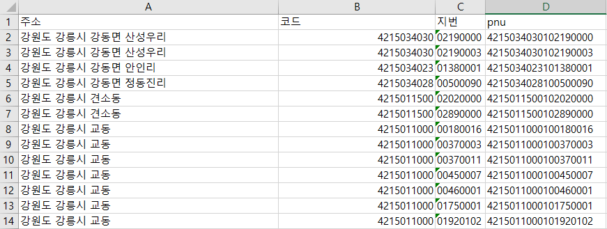 - 법정동 주소 형식을 PNU 코드로 바꾸기