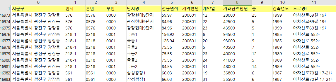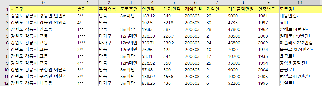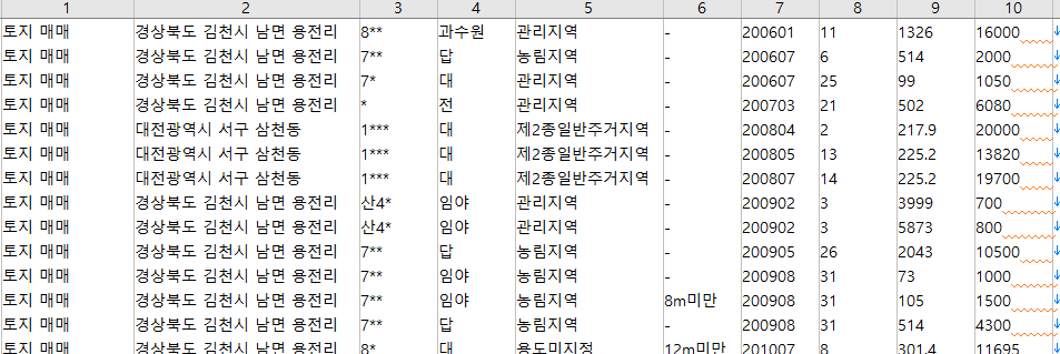 법정동 단위까지만 제공되는 경우는 번지를 별표처리했다. 그런데 위의 예를 보면 5** 번지는 500번대 번지, 1***대 번지는 1000번대 번지라는 것을 추측할 수 있다. 사실 10-1을 1***으로 처리한 것일수도 있지만, 최대 자리수가 네자리인 것으로 보아 본번과 부번 중 본번만 별표처리하여 표기한 것 같다. 굳이 부번까지 특정하고자 하면 여러가지 데이터를 조합하여 찾아낼 수 있을 것 같기도 하지만, 일단 여기서는 공개한 수준까지만 처리하기로 한다.