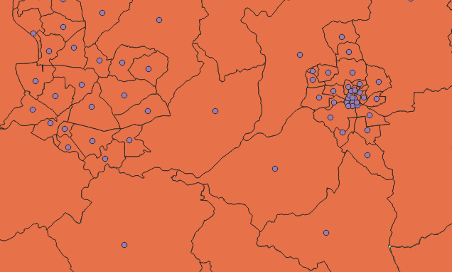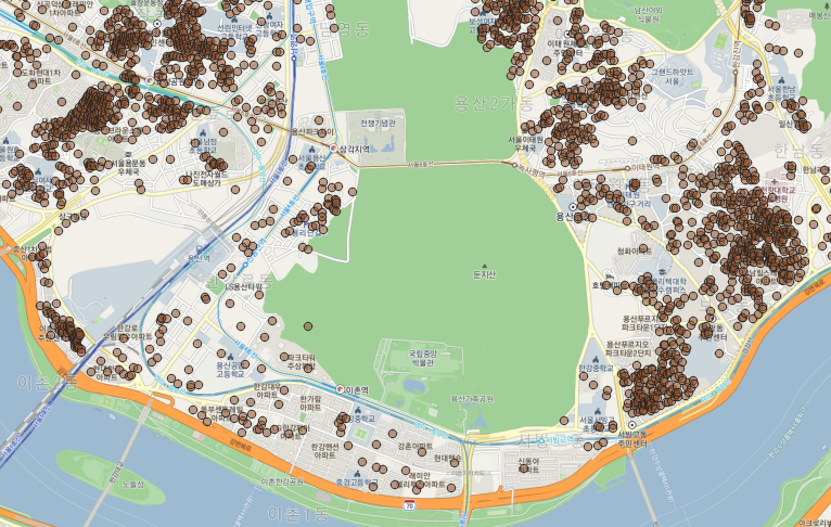 앞의 방식으로는 당연히 한 아파트에 하나의 좌표만 부여된다. 그러므로 한 아파트의 무수히 많은 거래가 모두 한 점에 찍히게 된다.