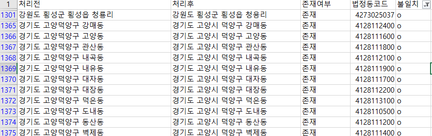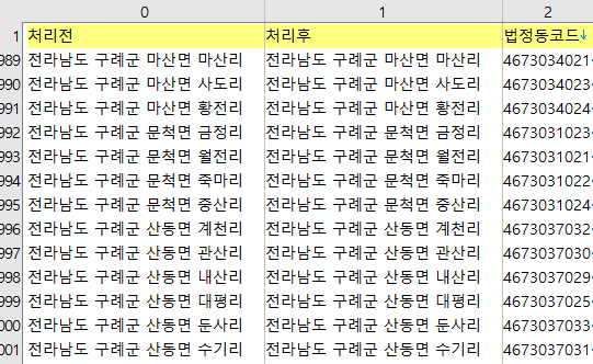 이제 '처리전' 열과 '법정동 코드' 열만 있으면 실거래가 원본 주소 문자열에서 법정동 코드를 뽑아낼 수 있다.