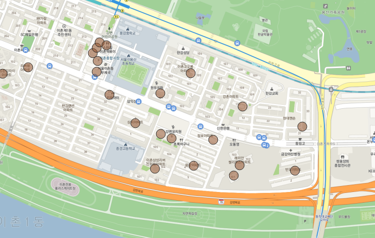 그냥 한 주소에 같은 좌표를 매칭시킨 후 실거래가를 지도에 뿌려보면 아래와 같은 그림이 나온다.