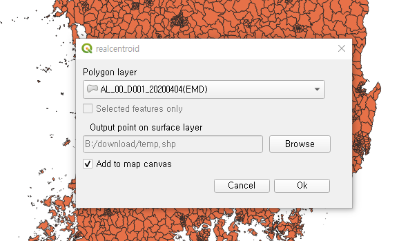 도형 내부의 중심점을 찾는 법은 여러가지가 있을텐데, 플러그인 중 RealCentroid 를 다운받아서 실행시켜보자.