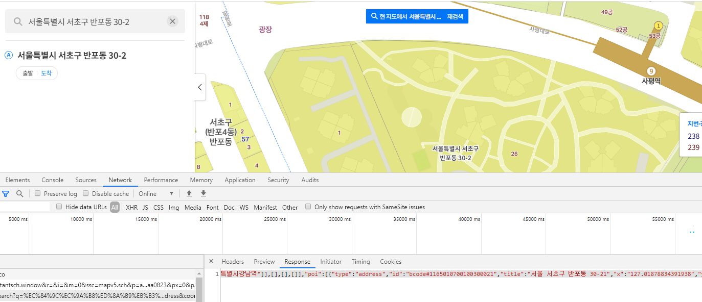 위치를 찾는 듯 하지만, 반환되는 json 정보를 열어보면 정확한 좌표값이 없고, 유사 주소로 추측하는 듯 하다.