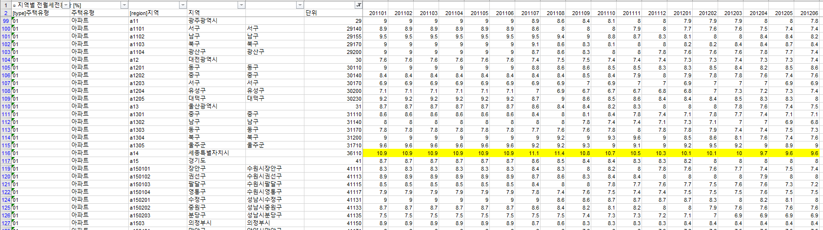 위의 그림처럼 생겼다. 세종시같은 경우 2012년 이전에는 없으므로 충청남도의 값을 복사해서 (혹시 모르니) 빈칸을 채워둔다.