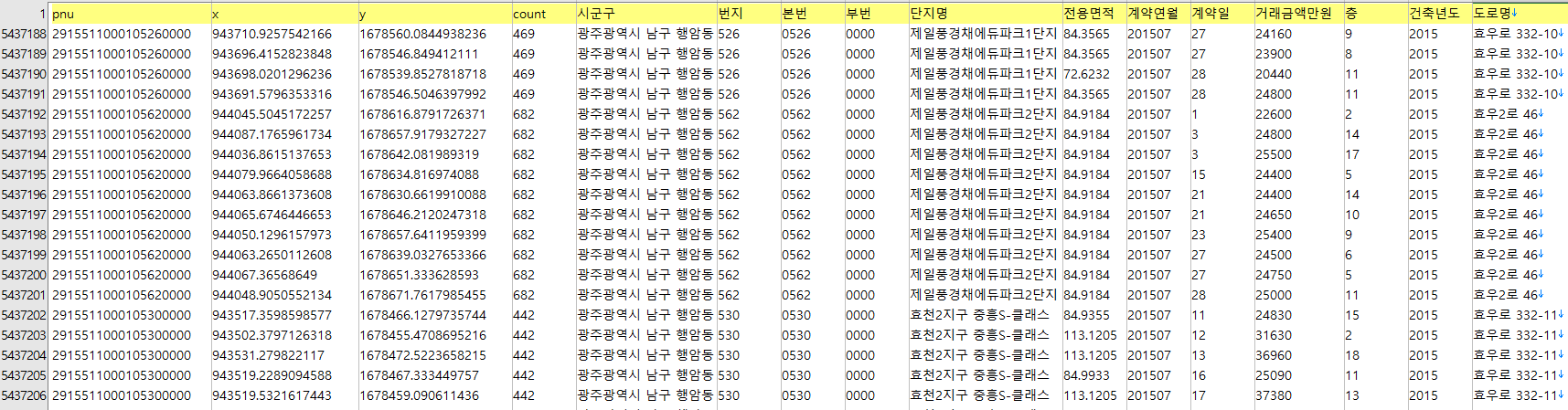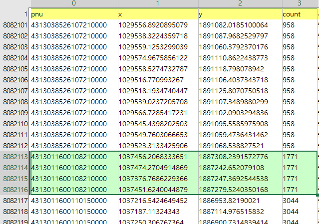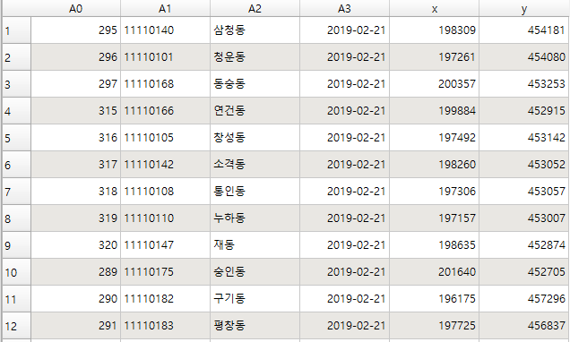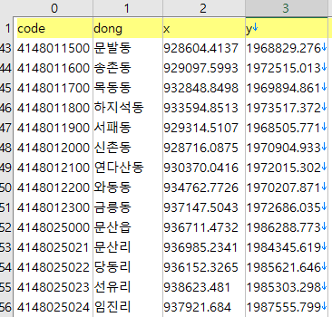 위에서 3번 열이 PNU 코드, 4번 5번이 각각 x, y 좌표다.