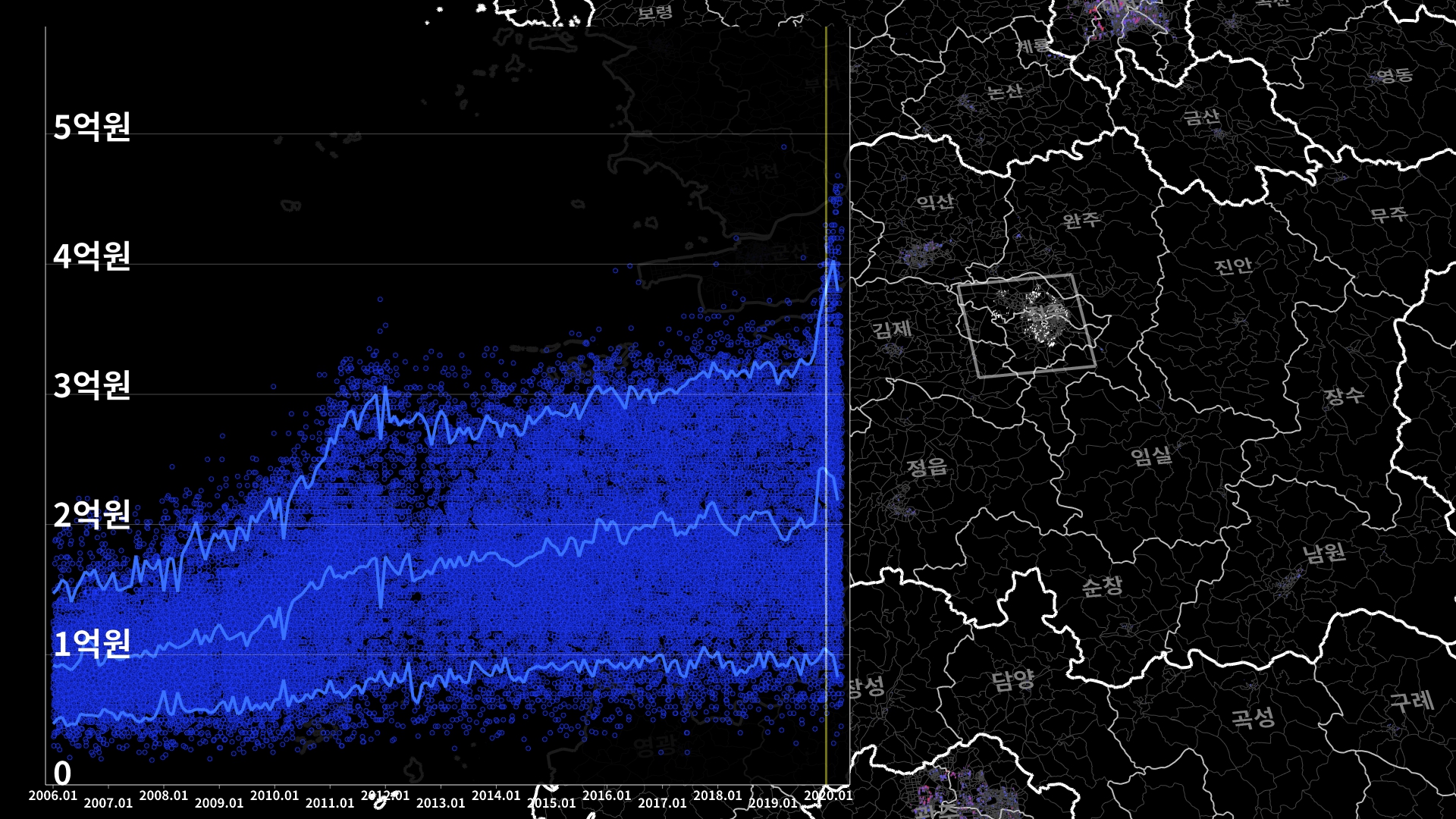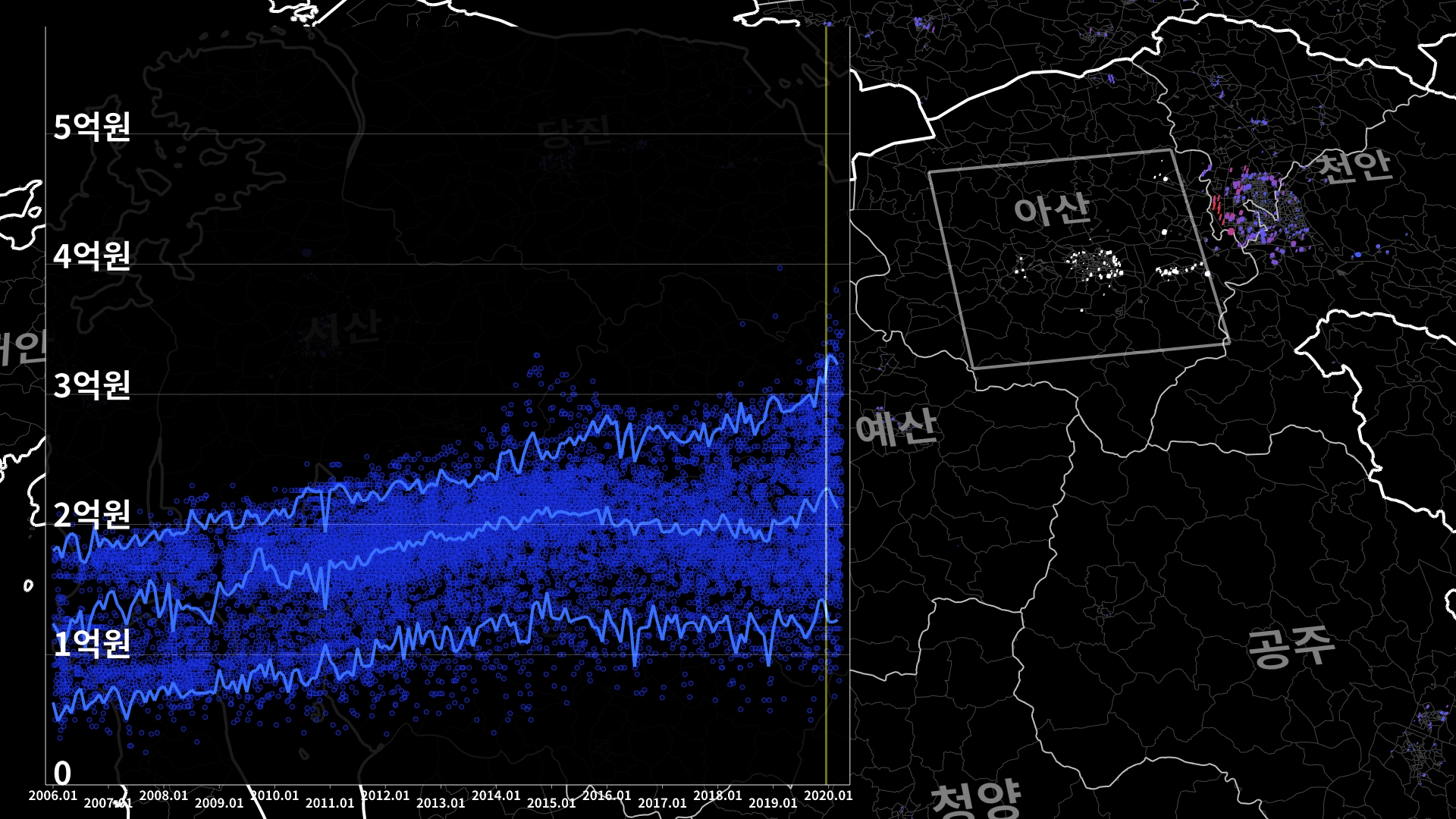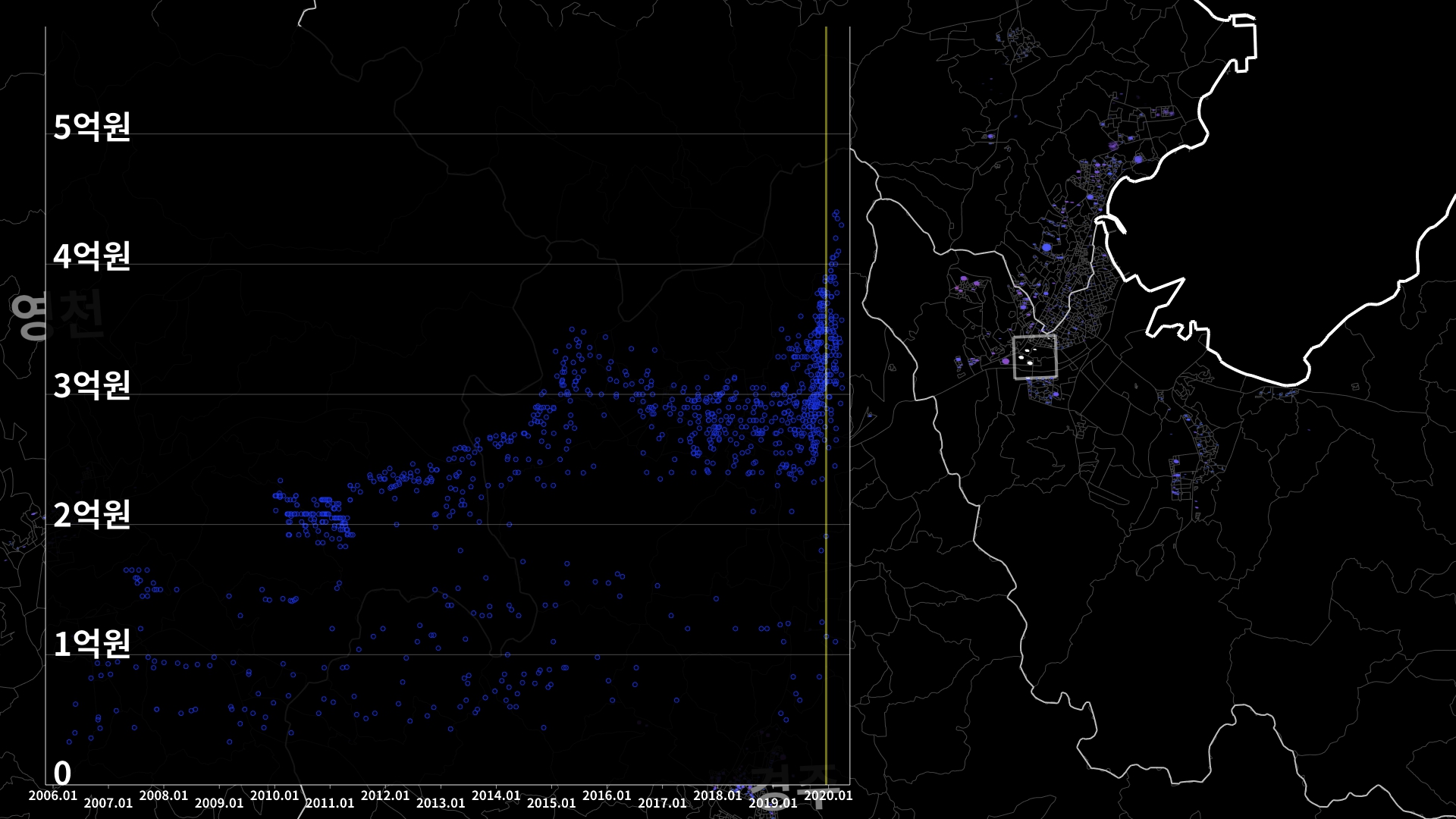 가로축은 시간이고, 세로축은 가격이므로 점 하나하나는 실거래된 시기와 가격을 가리킨다.