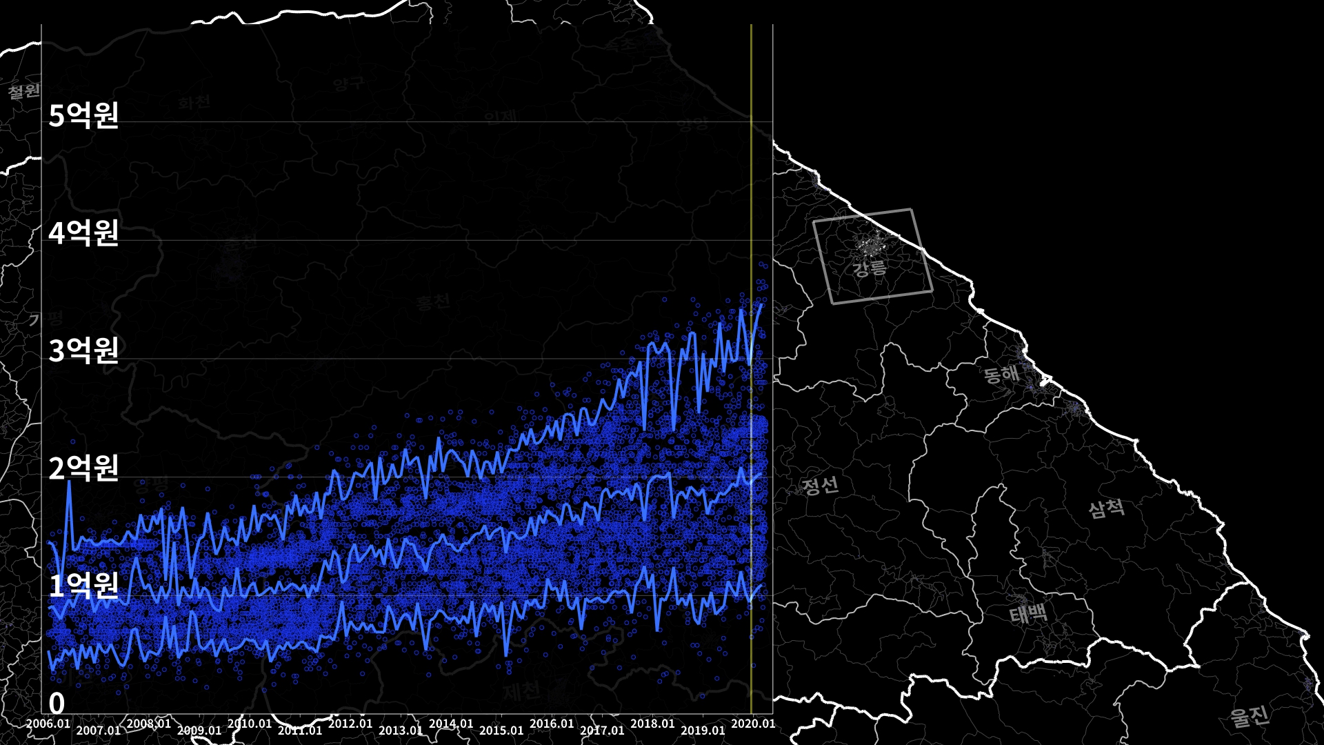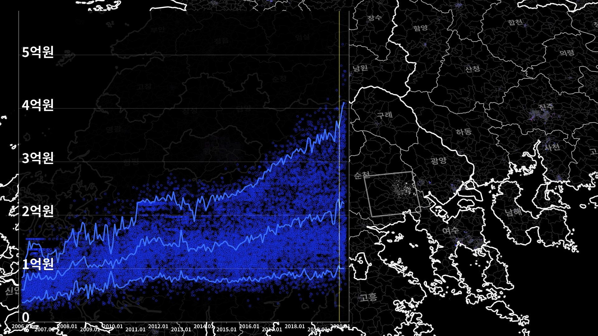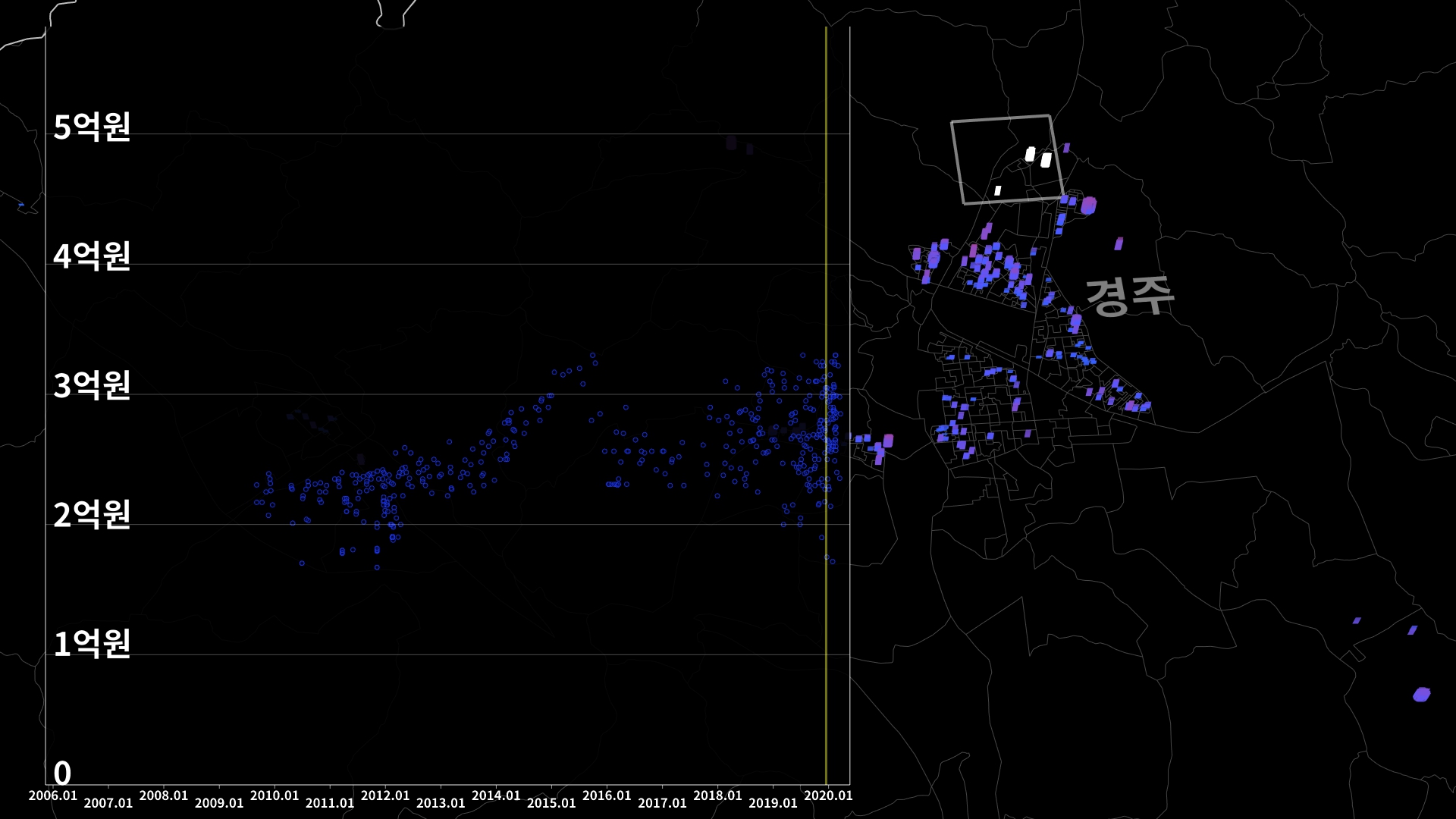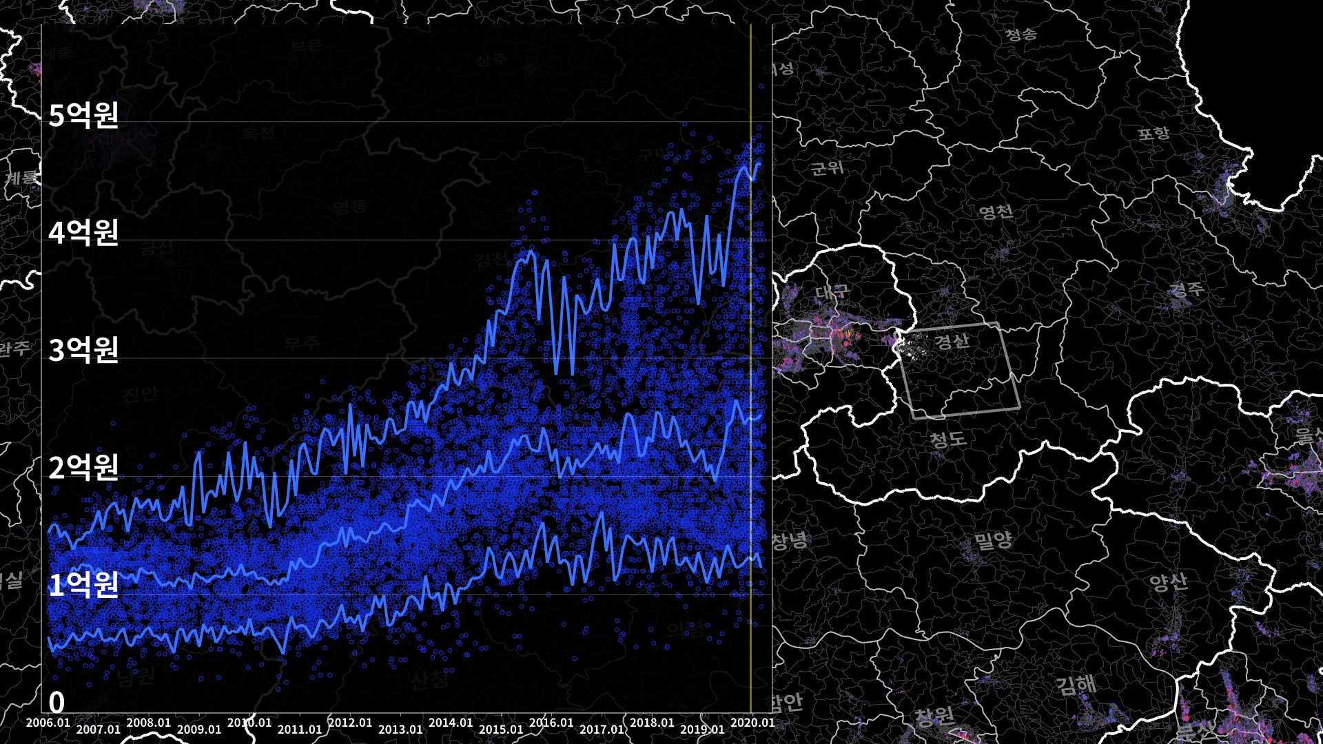 가로축은 시간이고, 세로축은 가격이므로 점 하나하나는 실거래된 시기와 가격을 가리킨다.