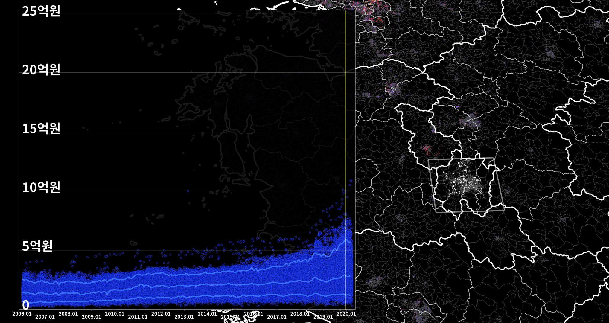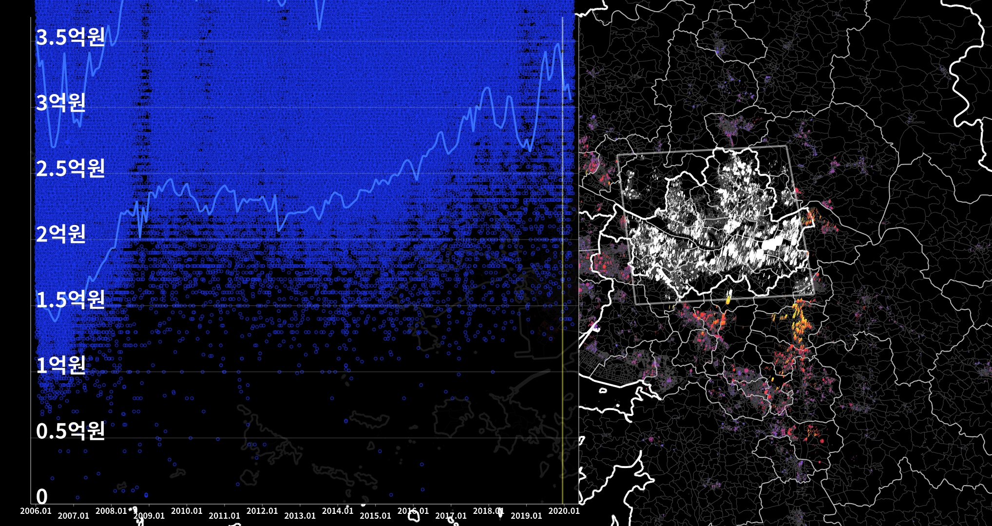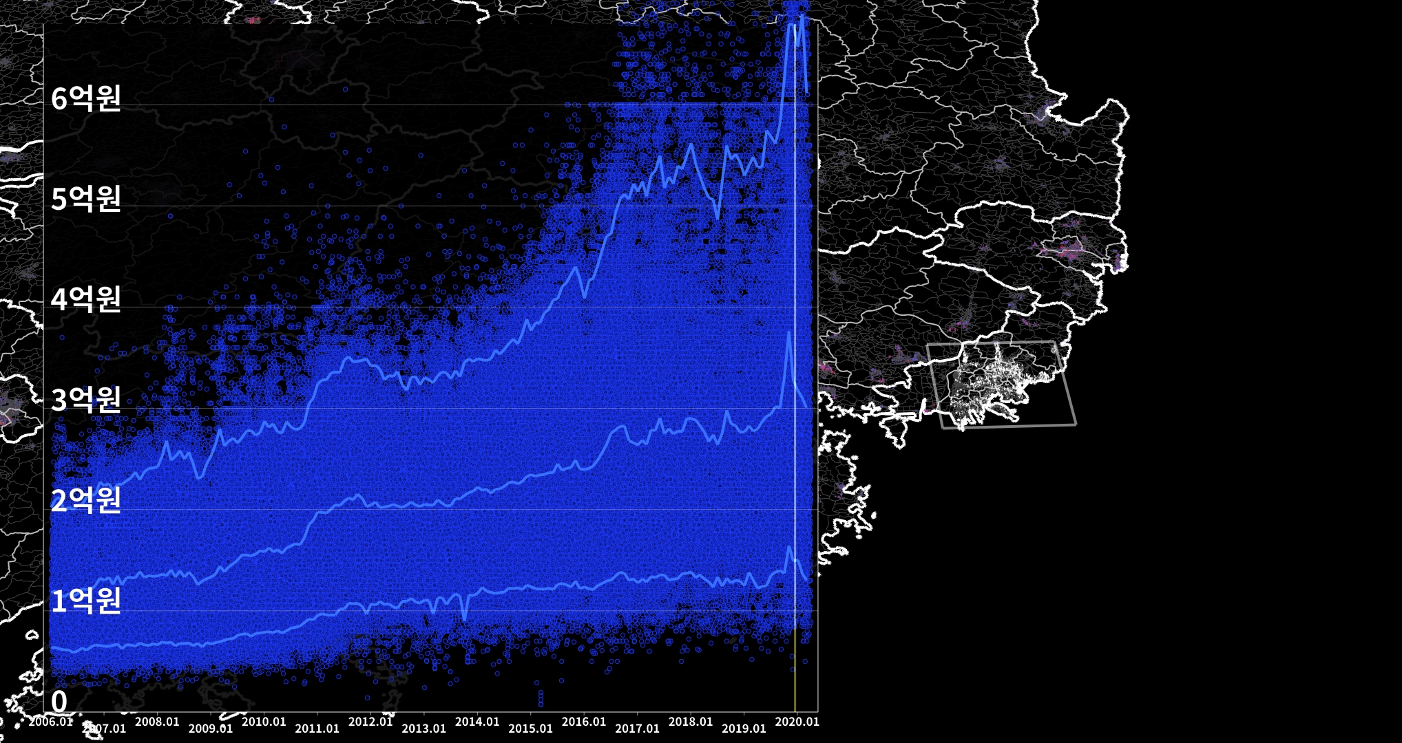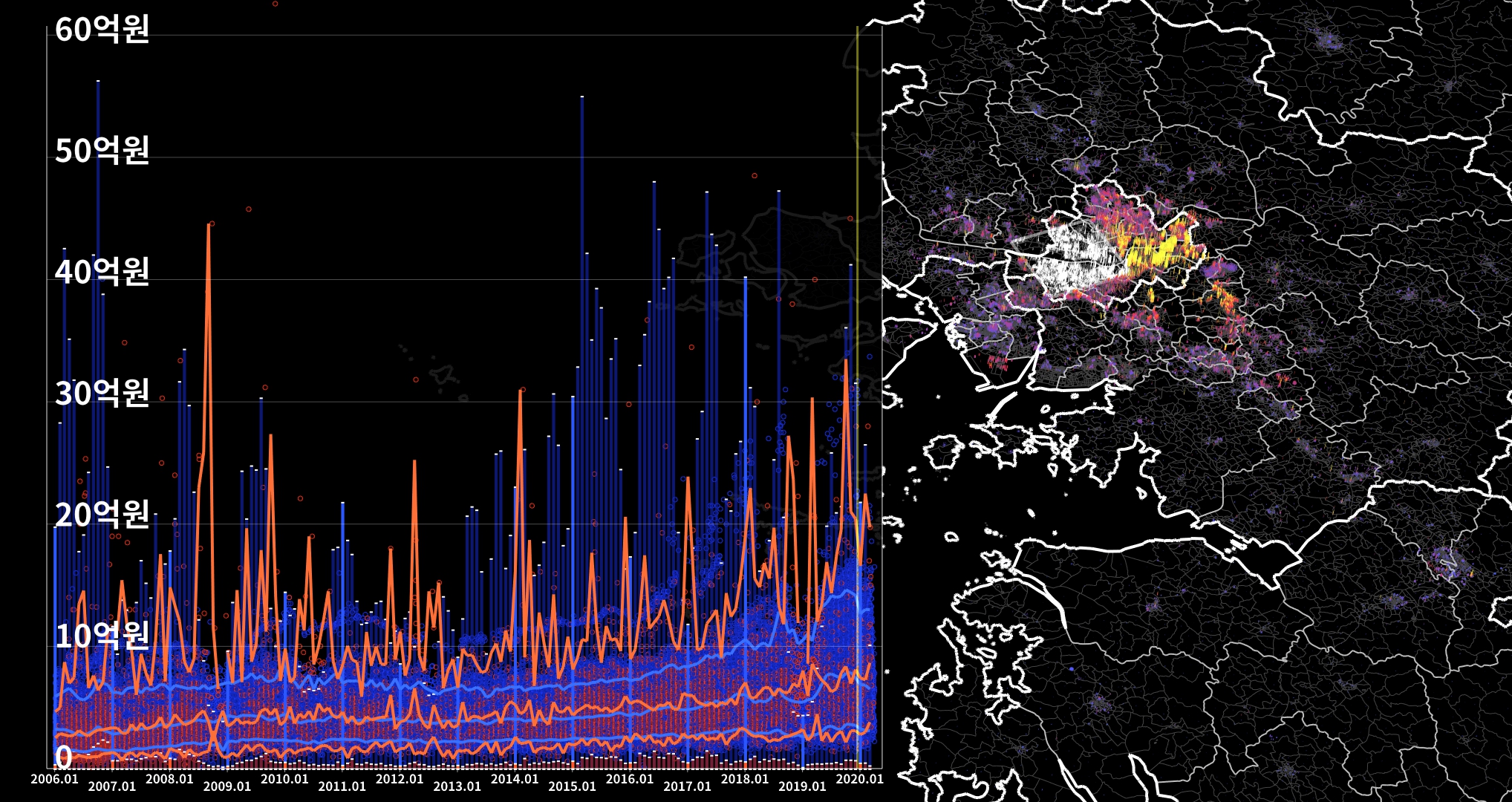 지도부터 설명하자면, 지도에 솟아오른 막대 하나하나는 실거래가 1건을 가리킨다. 막대의 높이는 실거래가에 비례하도록 두었고, 색상 역시 그러하다. 저 그림에서는 푸른색 -> 붉은색 -> 노란색일수록 실거래가 높다. 경우에 따라 다른 계열의 그라데이션이 사용될 때도 있다.