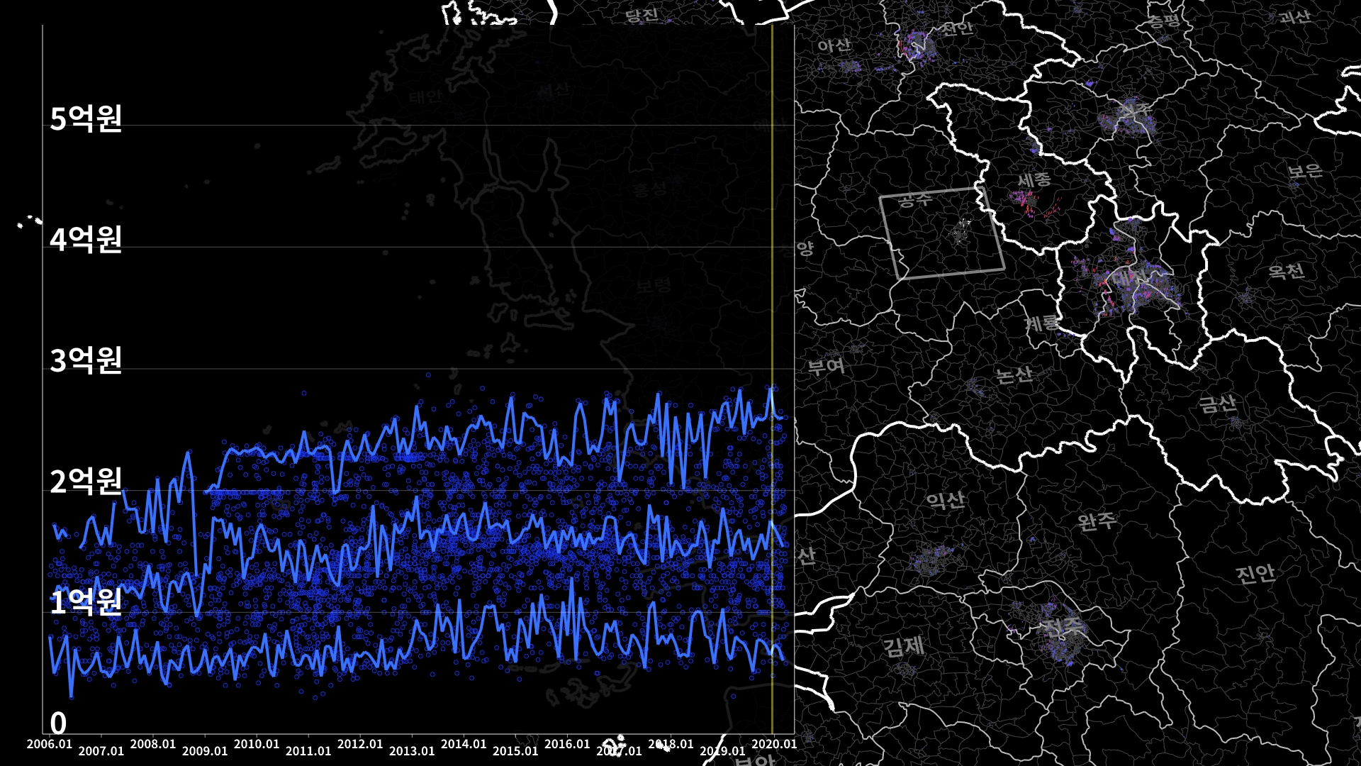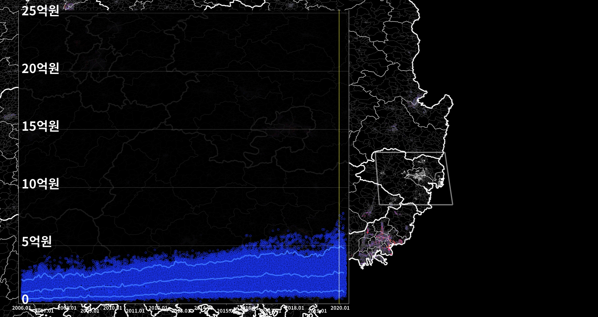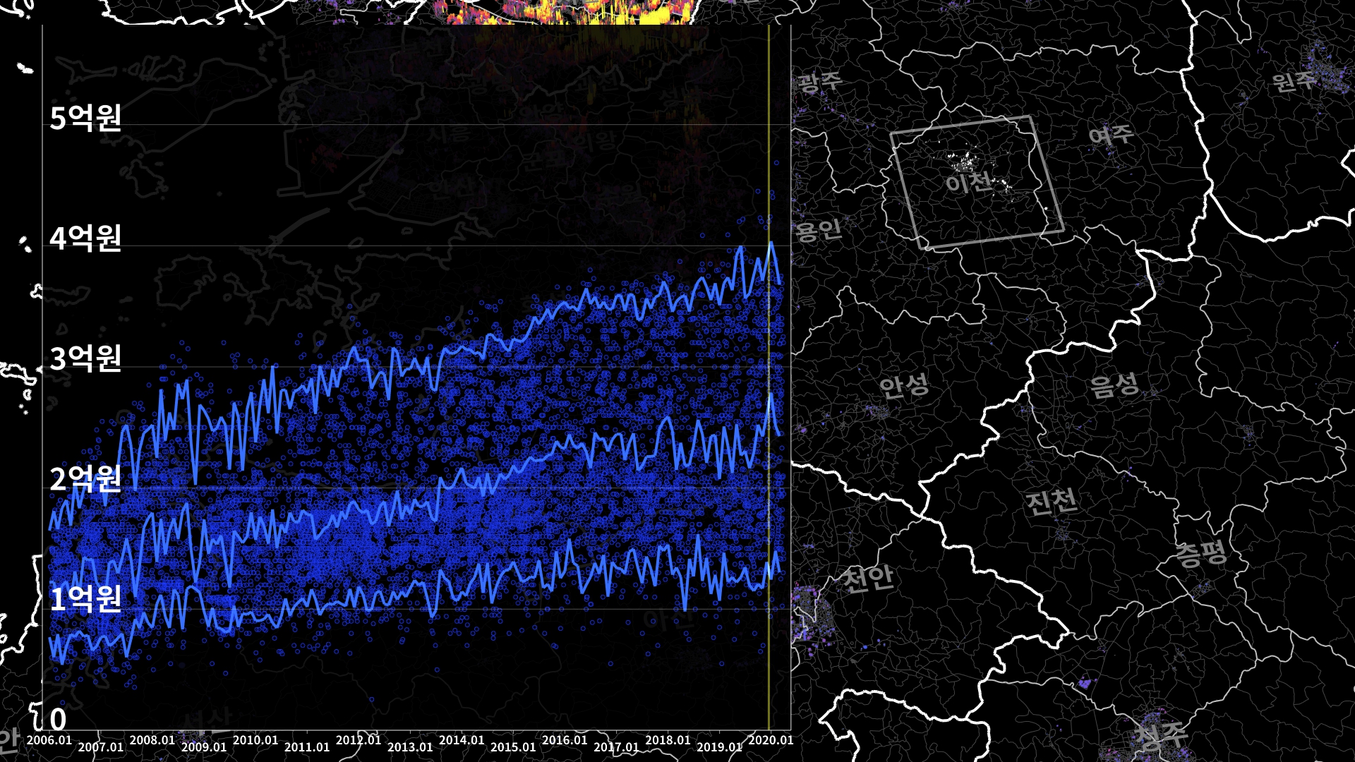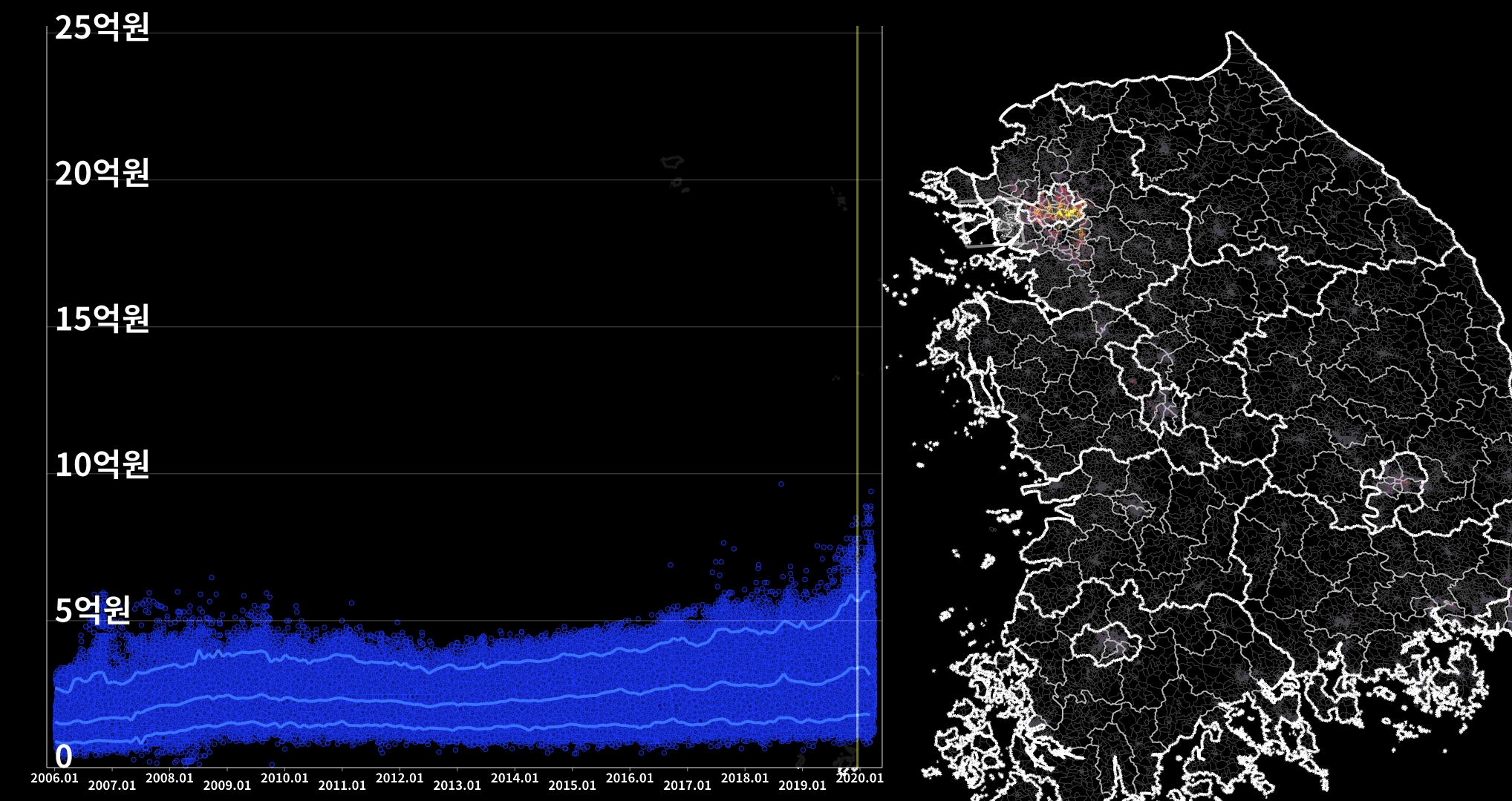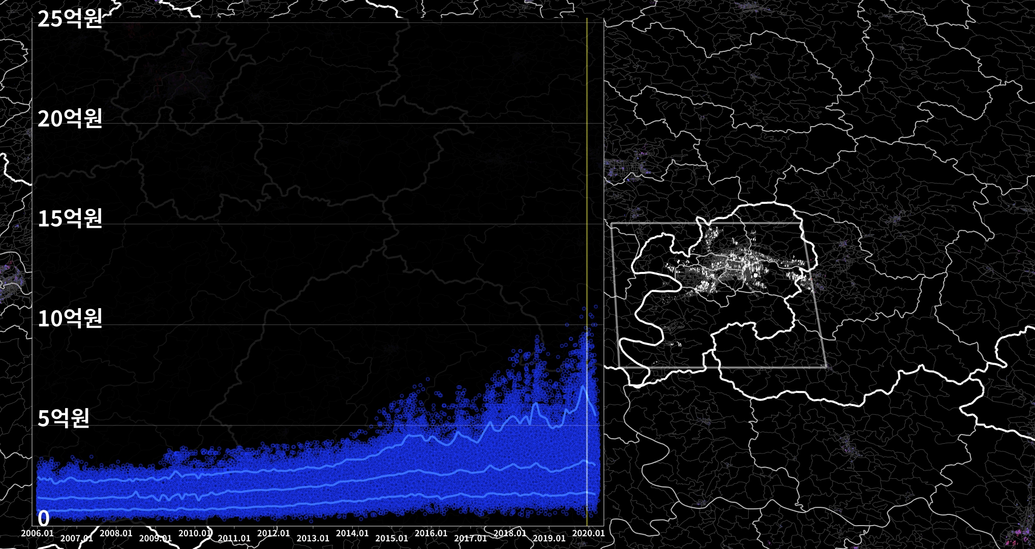 지도부터 설명하자면, 지도에 솟아오른 막대 하나하나는 실거래가 1건을 가리킨다. 막대의 높이는 실거래가에 비례하도록 두었고, 색상 역시 그러하다. 저 그림에서는 푸른색 -> 붉은색 -> 노란색일수록 실거래가 높다. 경우에 따라 다른 계열의 그라데이션이 사용될 때도 있다.
