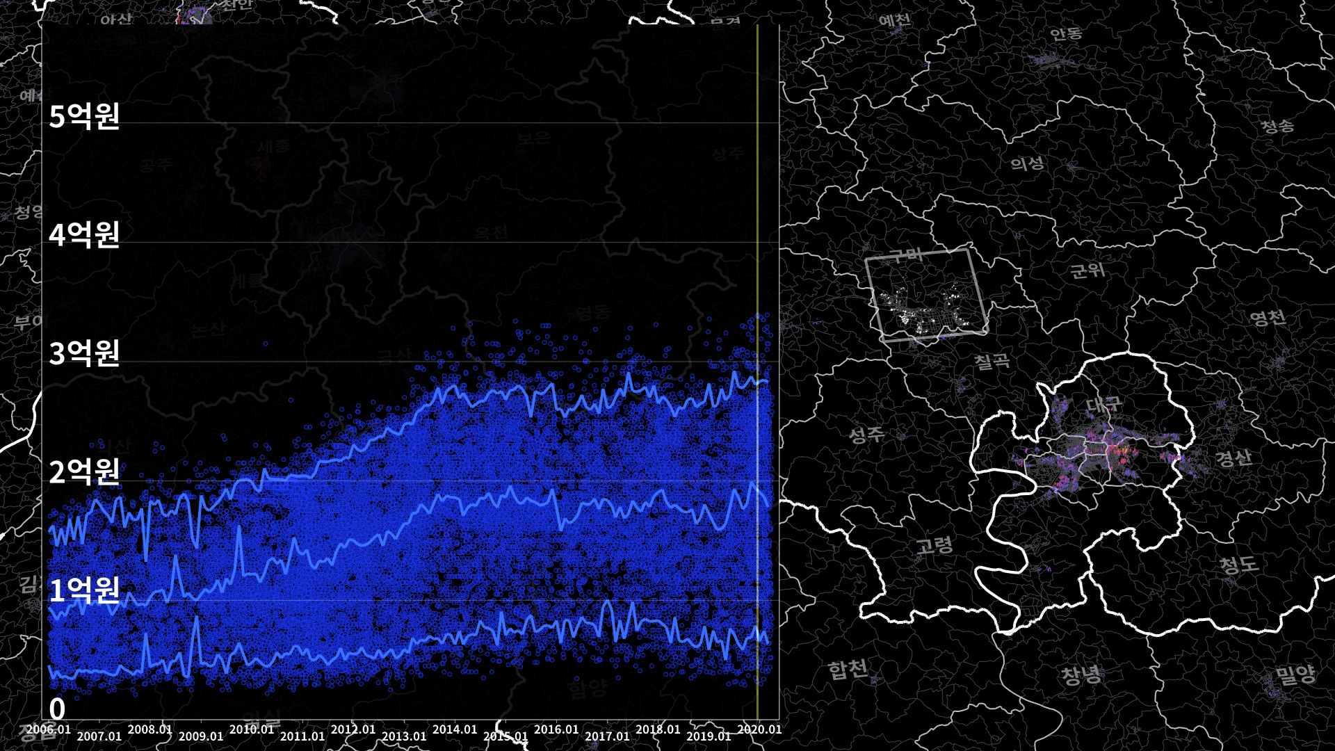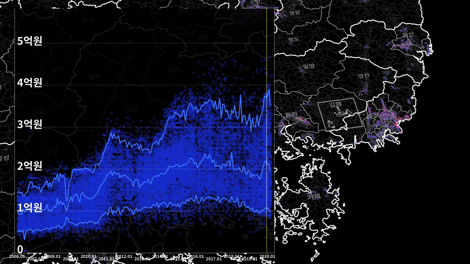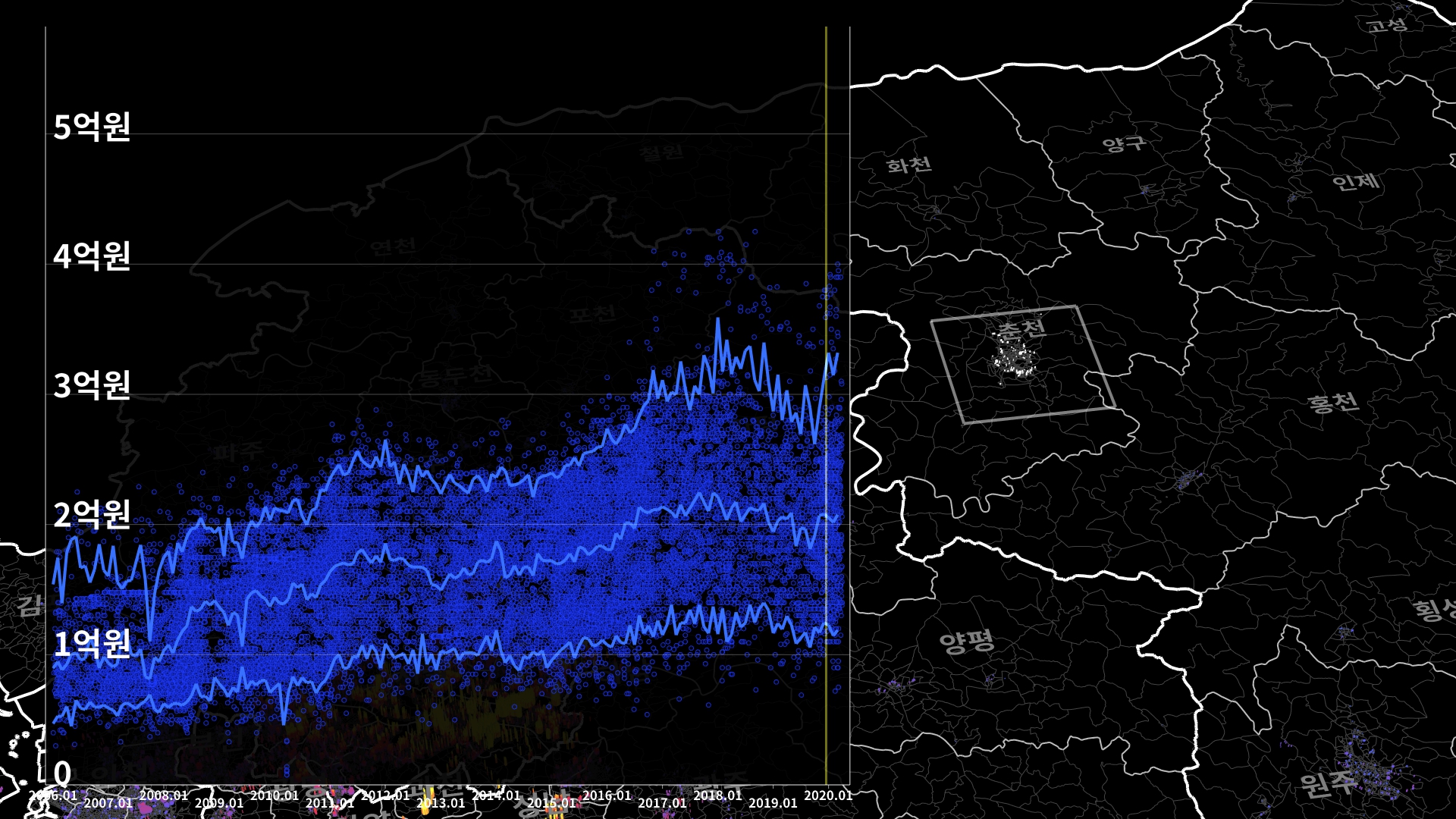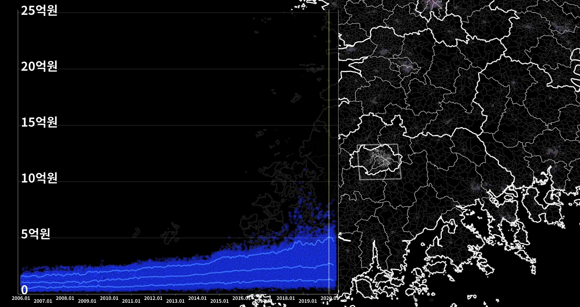 지도부터 설명하자면, 지도에 솟아오른 막대 하나하나는 실거래가 1건을 가리킨다. 막대의 높이는 실거래가에 비례하도록 두었고, 색상 역시 그러하다. 저 그림에서는 푸른색 -> 붉은색 -> 노란색일수록 실거래가 높다. 경우에 따라 다른 계열의 그라데이션이 사용될 때도 있다.