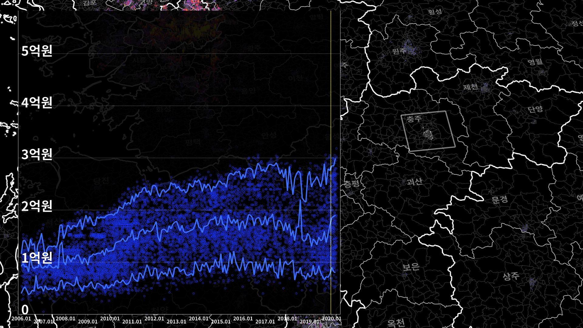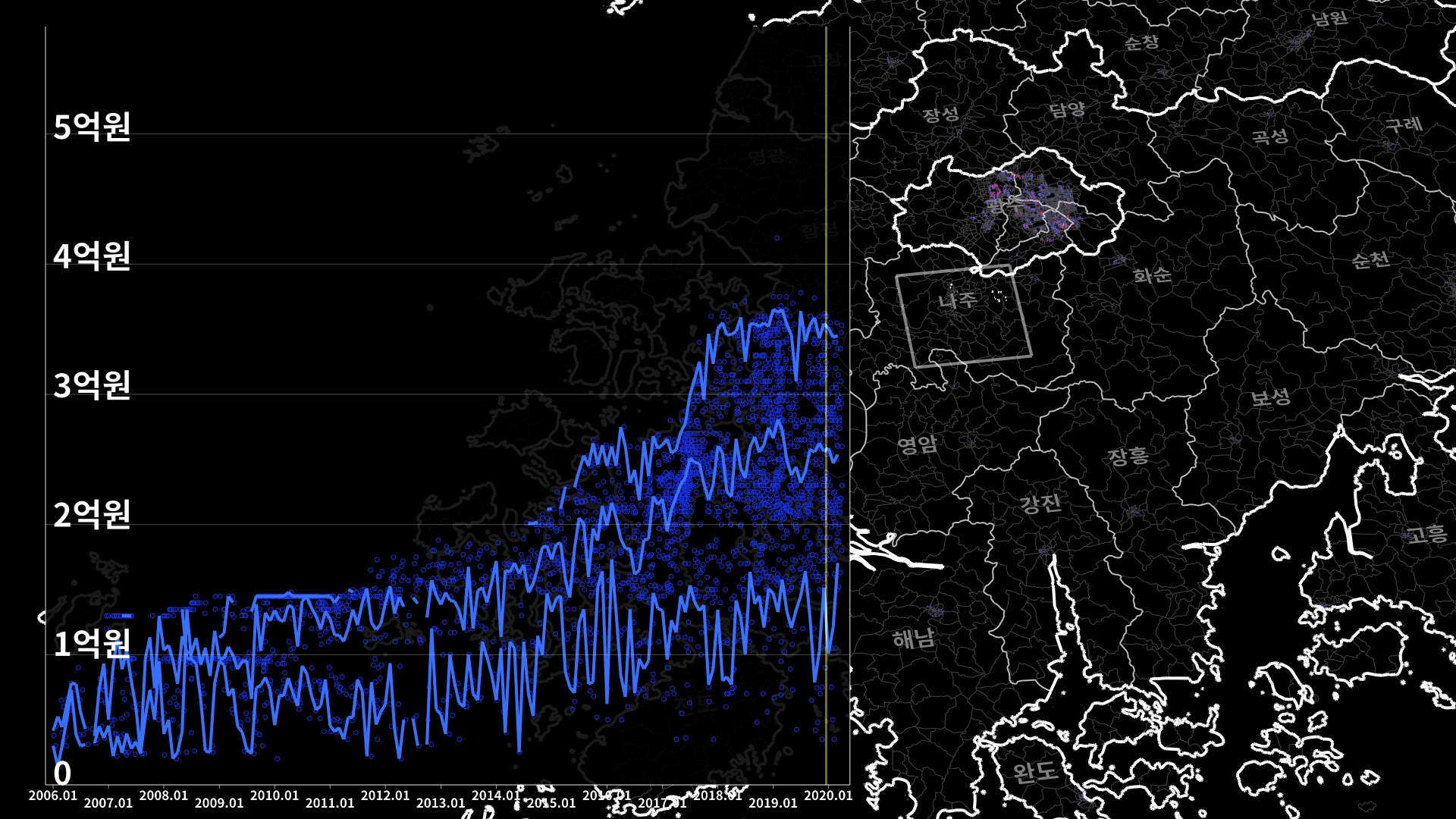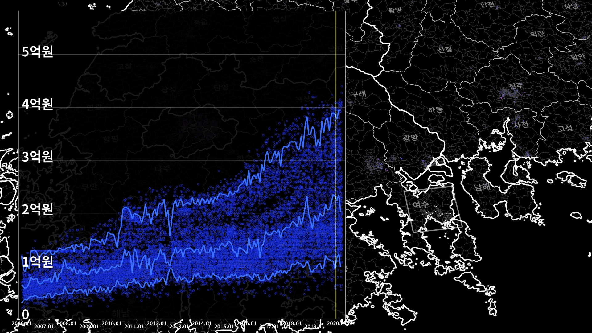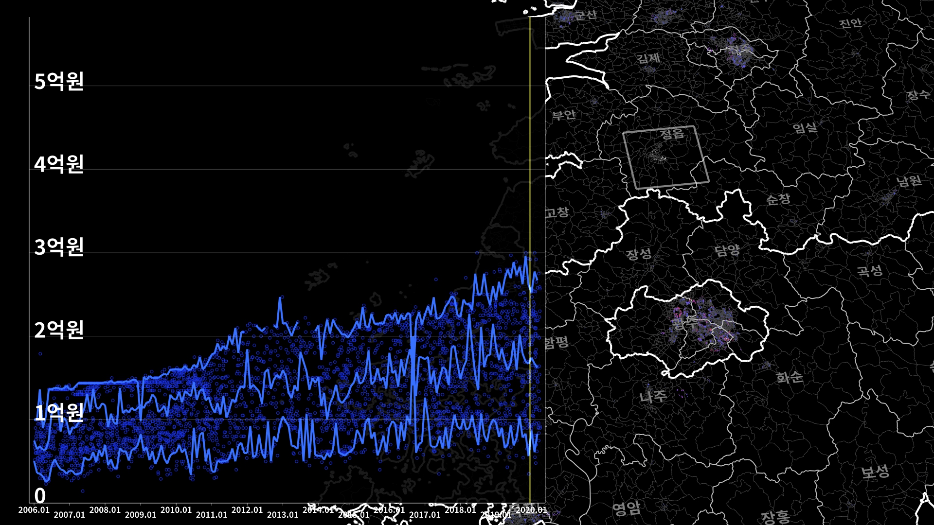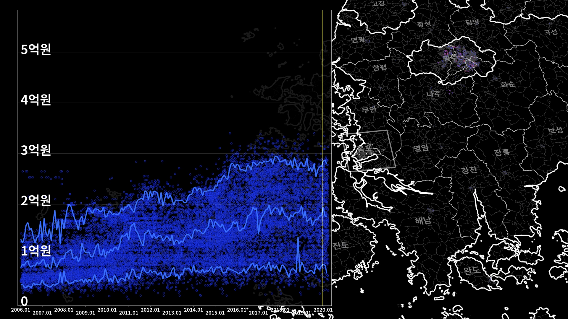 지도부터 설명하자면, 지도에 솟아오른 막대 하나하나는 실거래가 1건을 가리킨다. 막대의 높이는 실거래가에 비례하도록 두었고, 색상 역시 그러하다. 저 그림에서는 푸른색 -> 붉은색 -> 노란색일수록 실거래가 높다. 경우에 따라 다른 계열의 그라데이션이 사용될 때도 있다.