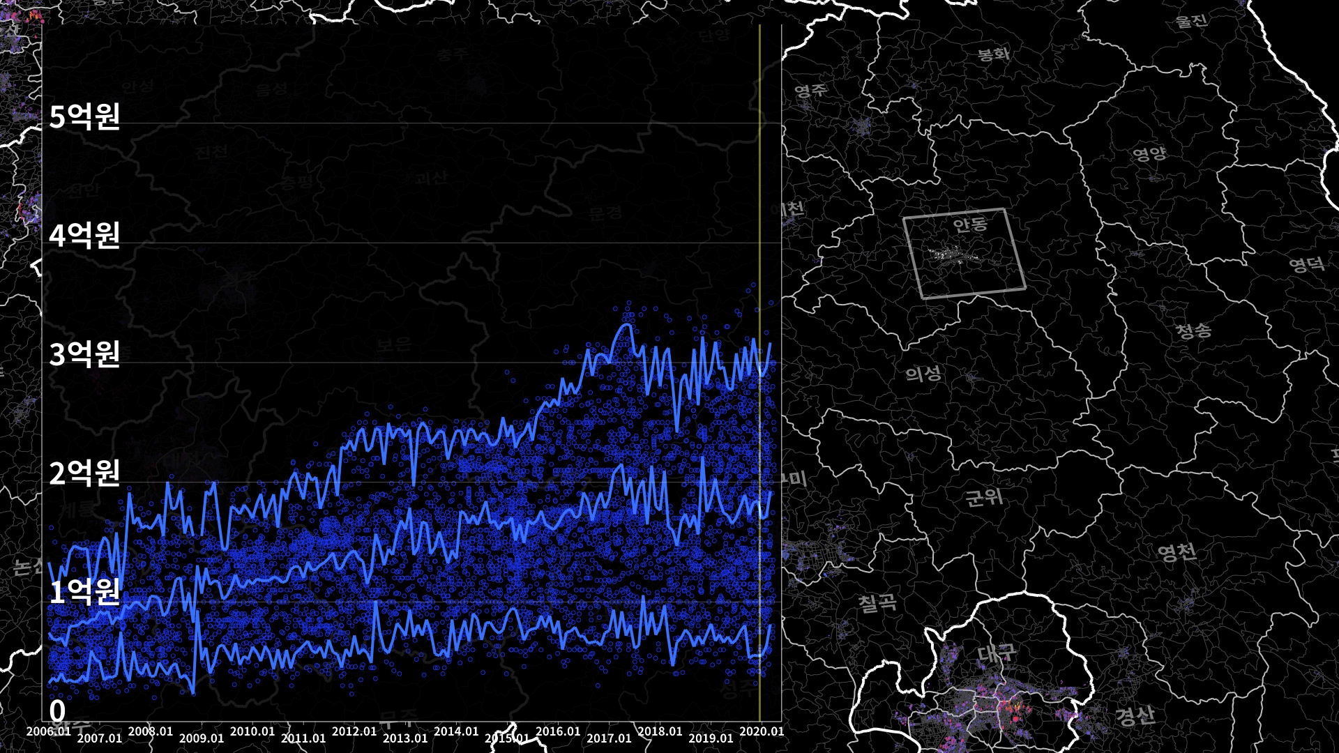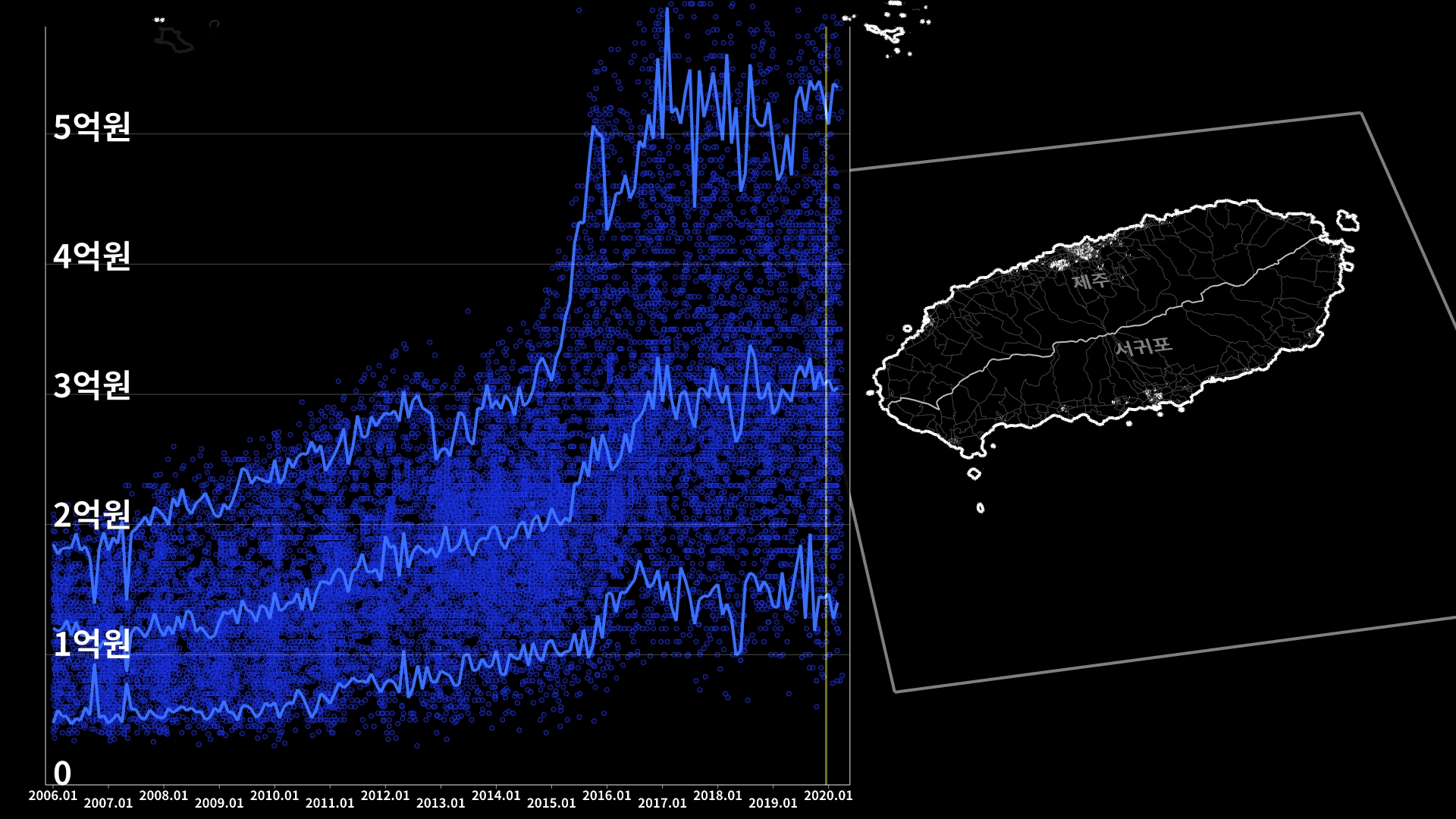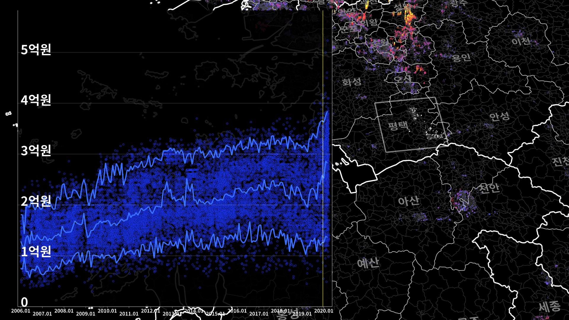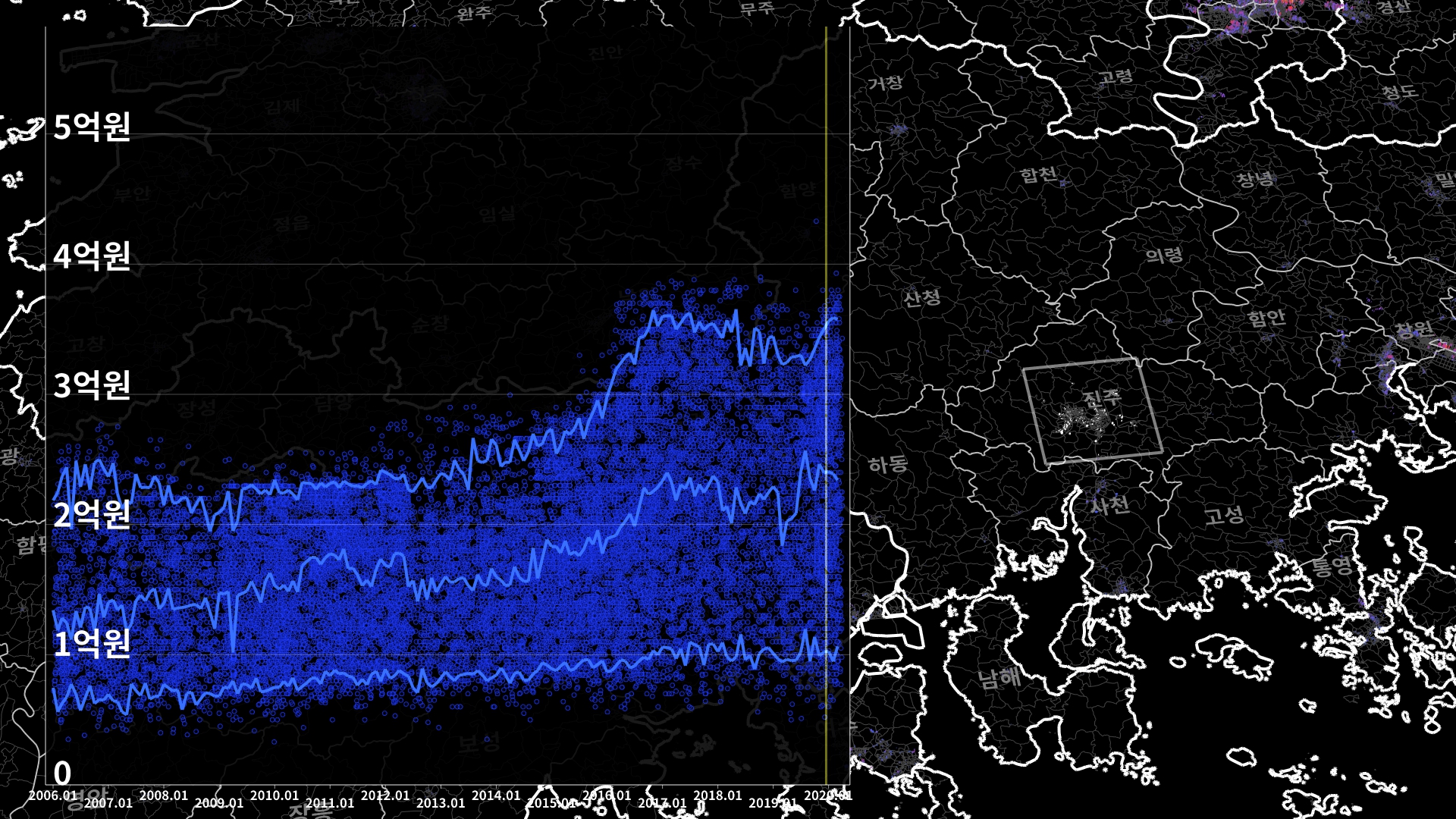 지도부터 설명하자면, 지도에 솟아오른 막대 하나하나는 실거래가 1건을 가리킨다. 막대의 높이는 실거래가에 비례하도록 두었고, 색상 역시 그러하다. 저 그림에서는 푸른색 -> 붉은색 -> 노란색일수록 실거래가 높다. 경우에 따라 다른 계열의 그라데이션이 사용될 때도 있다.
