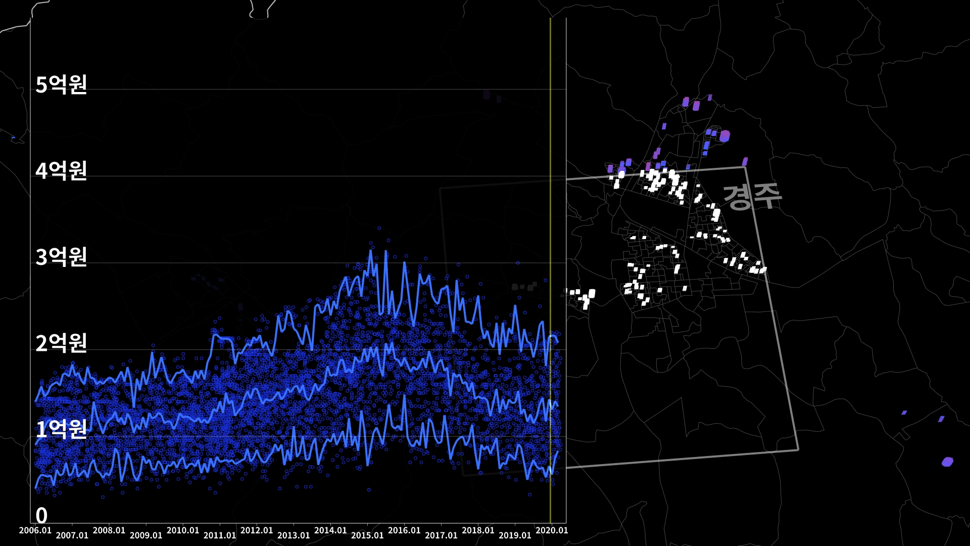 그래프에 표현되는 내용들은 오른쪽 지도에서 사각형 박스 안에 들어오는 거래건들이다. 행정구역을 경계로 하지 않고 크기가 조절 가능한 사각형 박스로 대상이 선택되도록 했다.