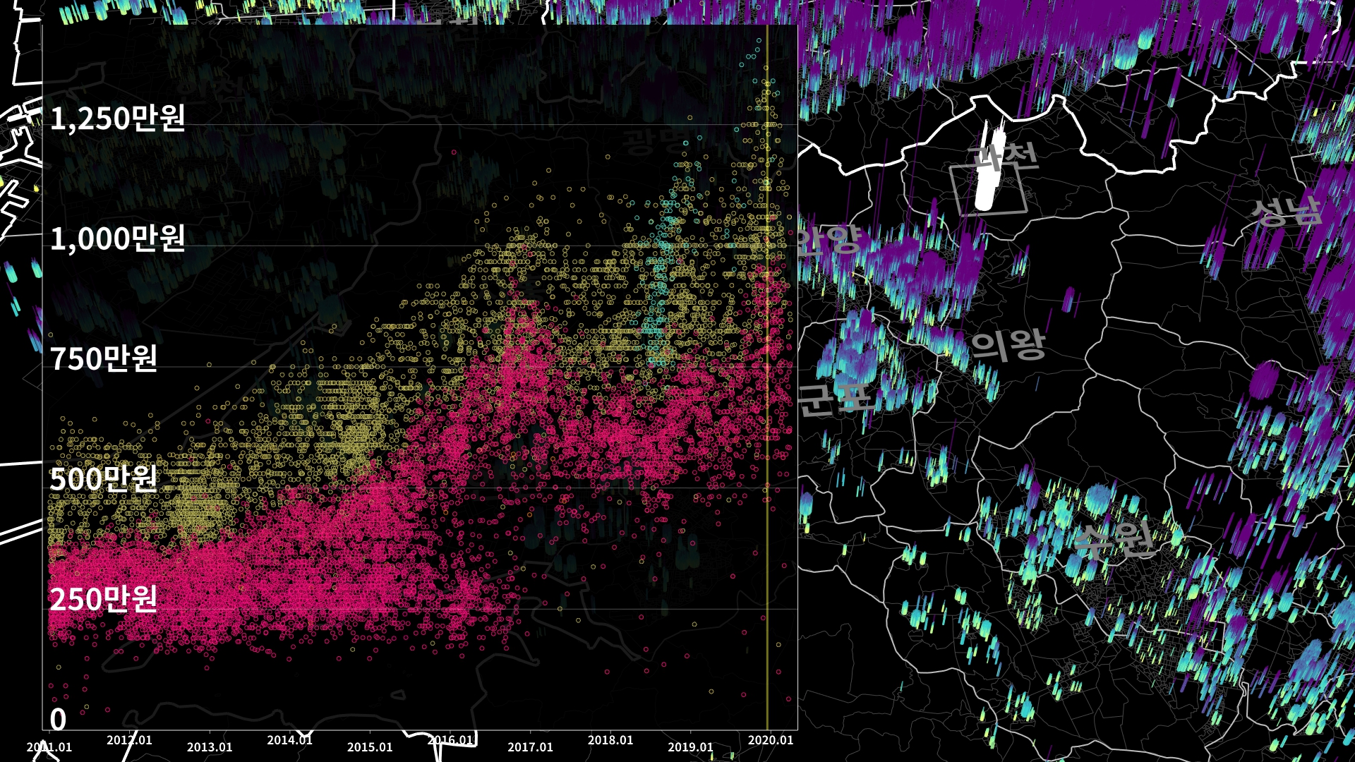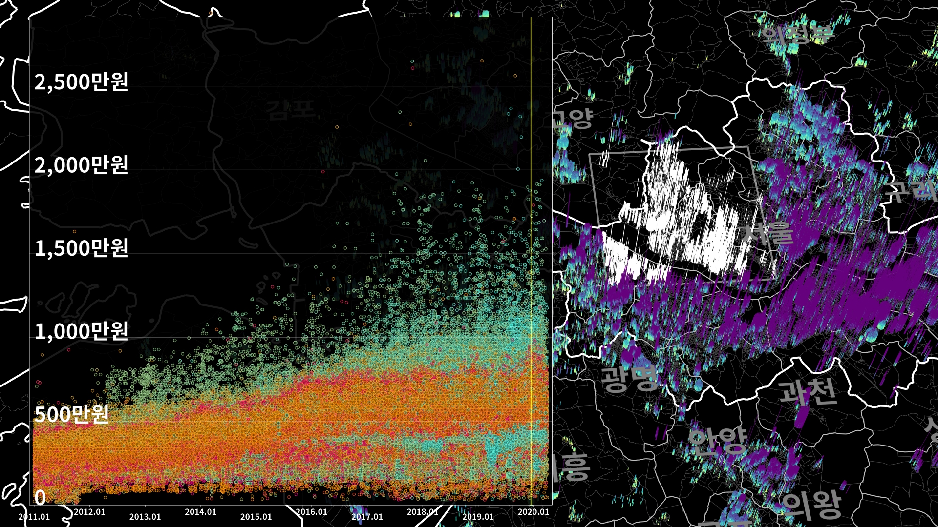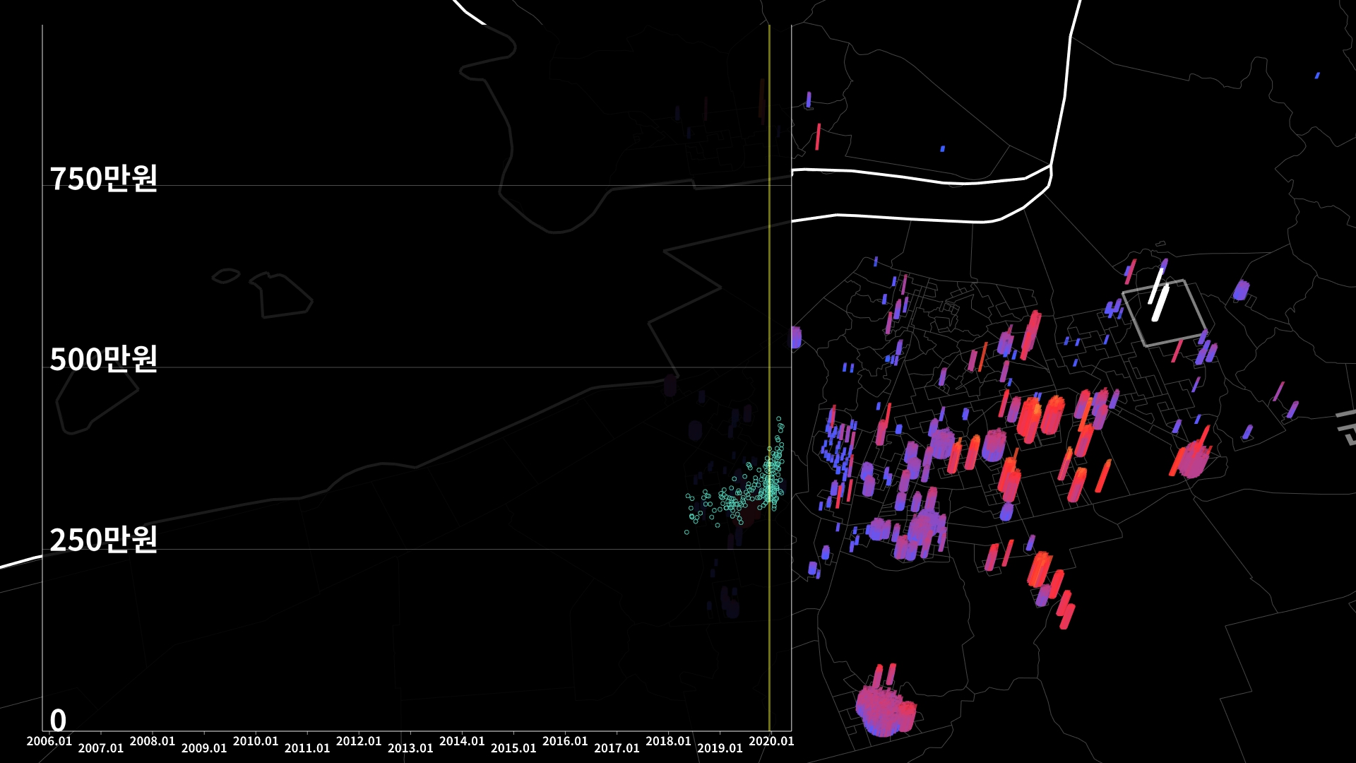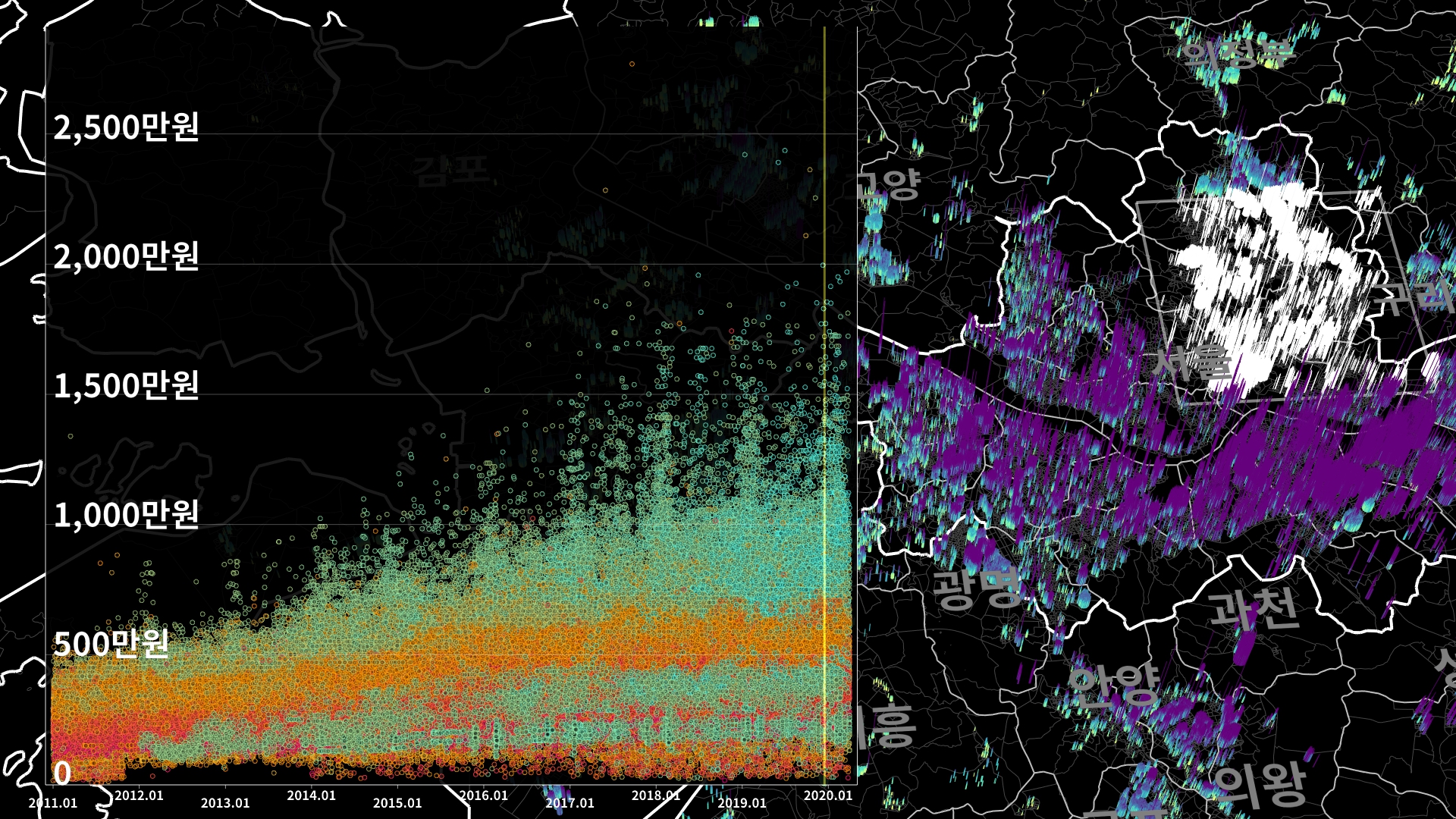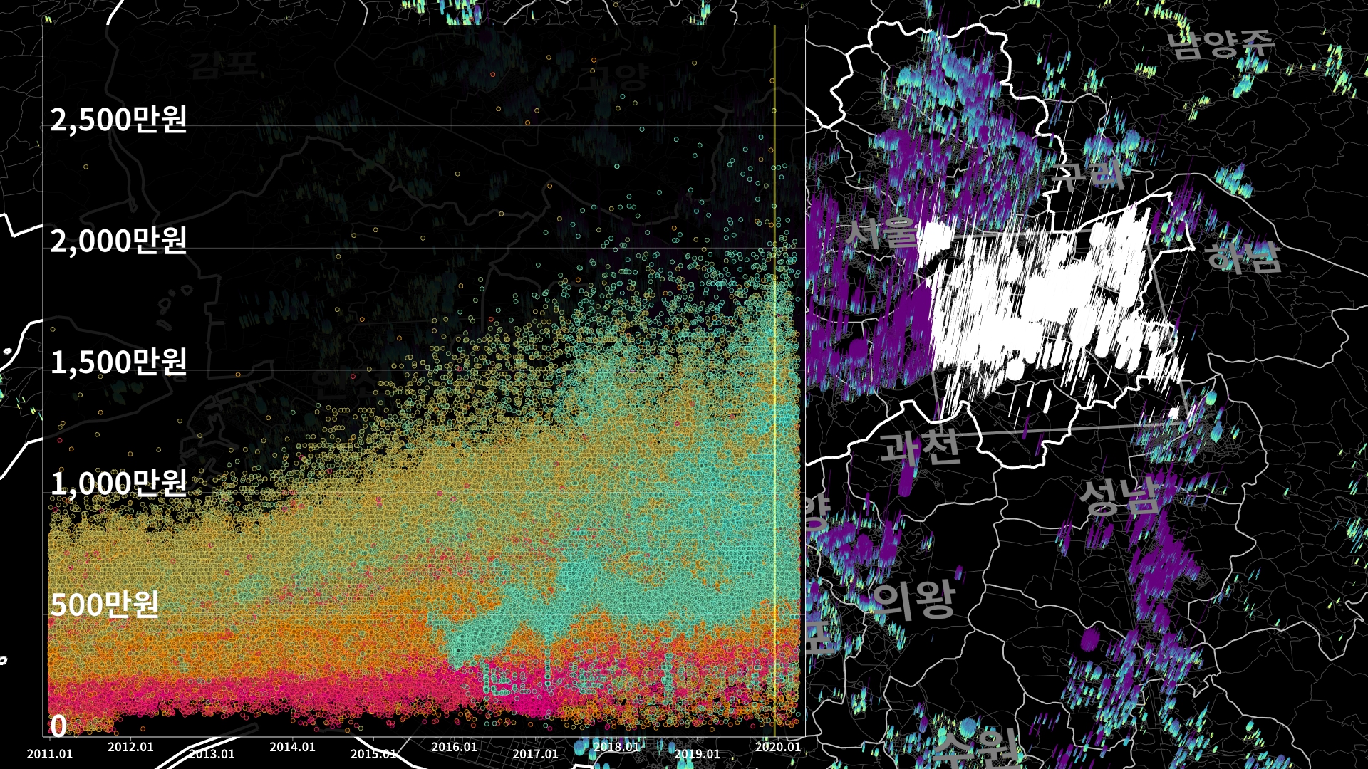 붉은색은 1980년경 혹은 그 이전에 완공된 아파트의 실거래건이고, 하늘색 계열로 올수록 2020년 최근에 신축한 아파트의 실거래건이다.