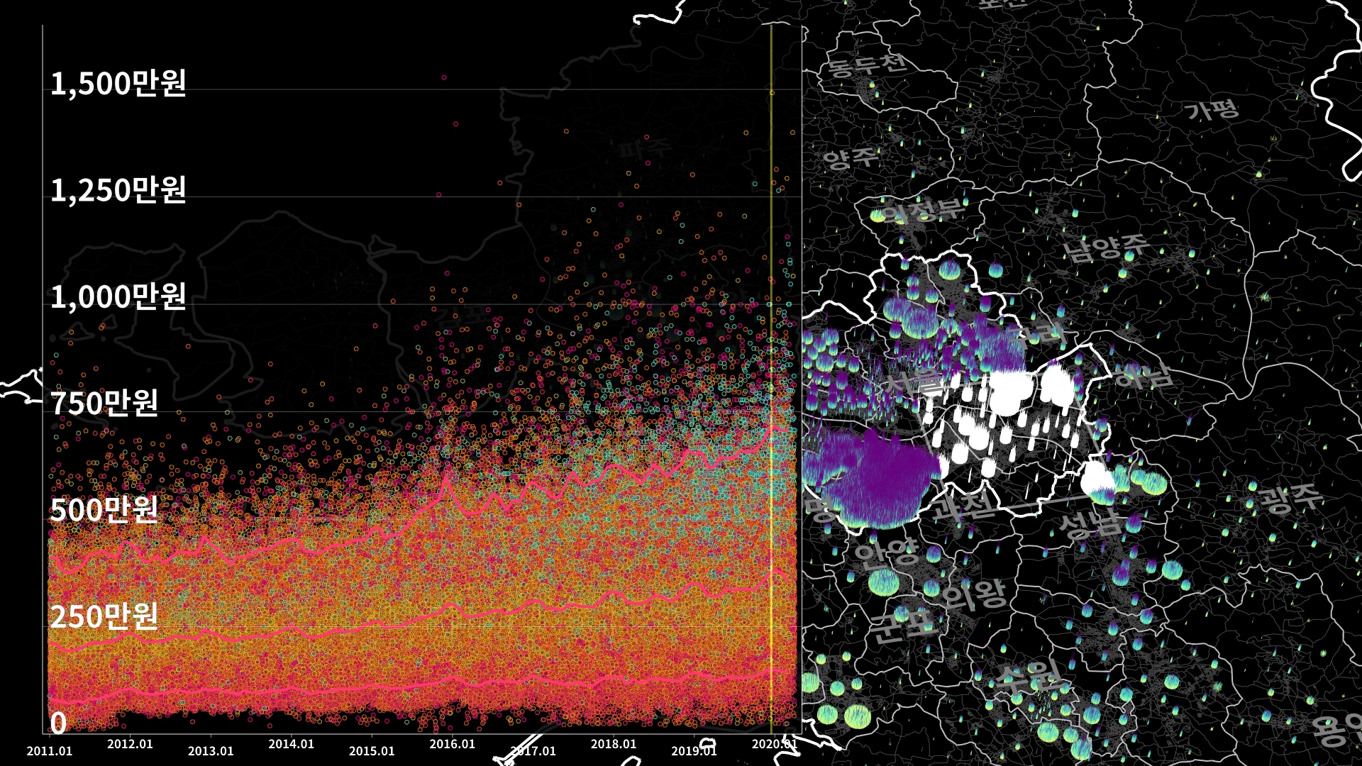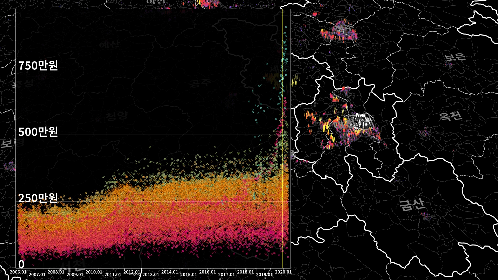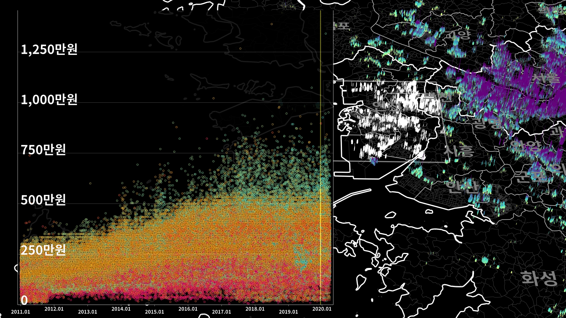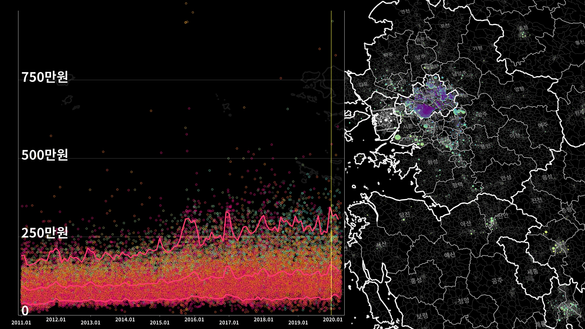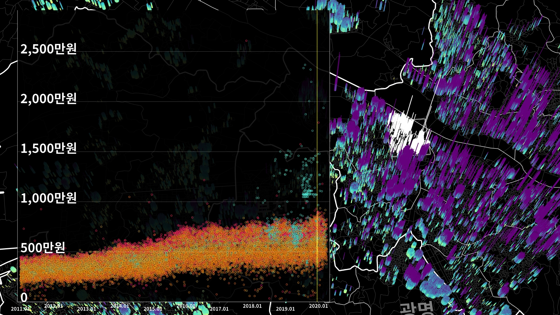 붉은색은 1980년경 혹은 그 이전에 완공된 아파트의 실거래건이고, 하늘색 계열로 올수록 2020년 최근에 신축한 아파트의 실거래건이다.