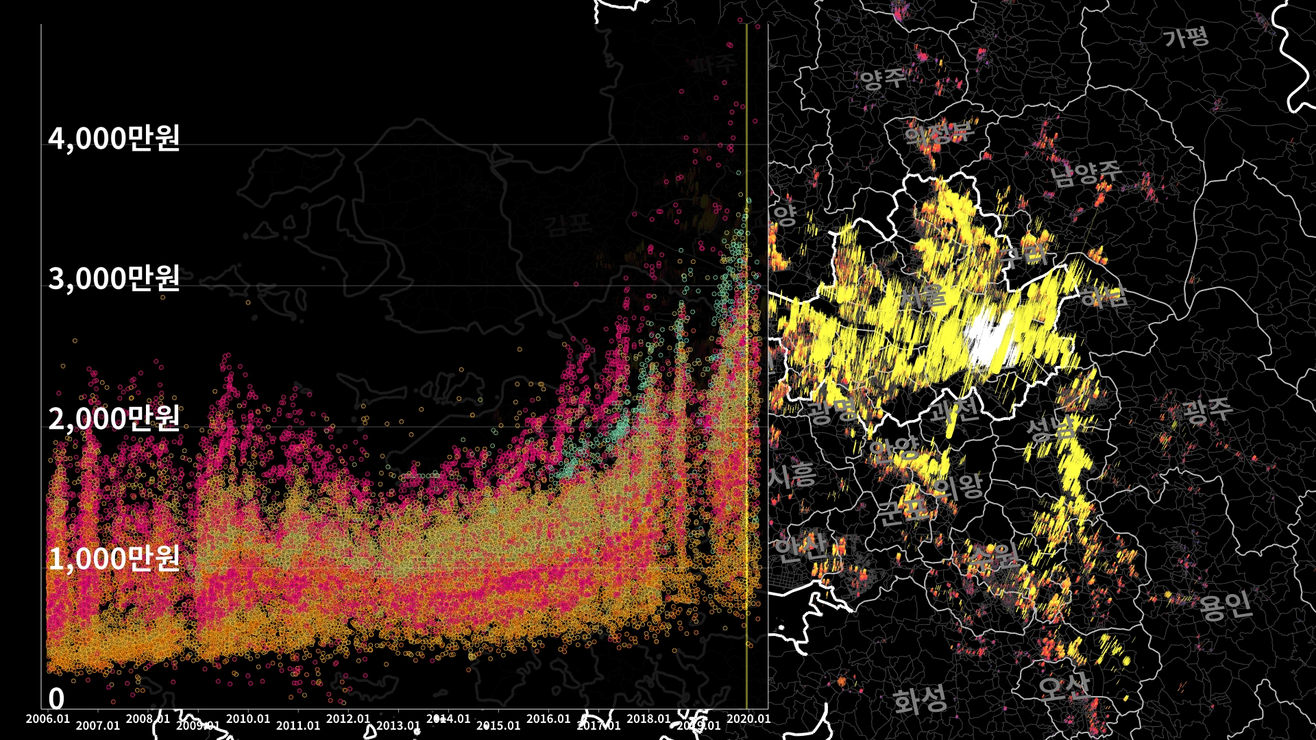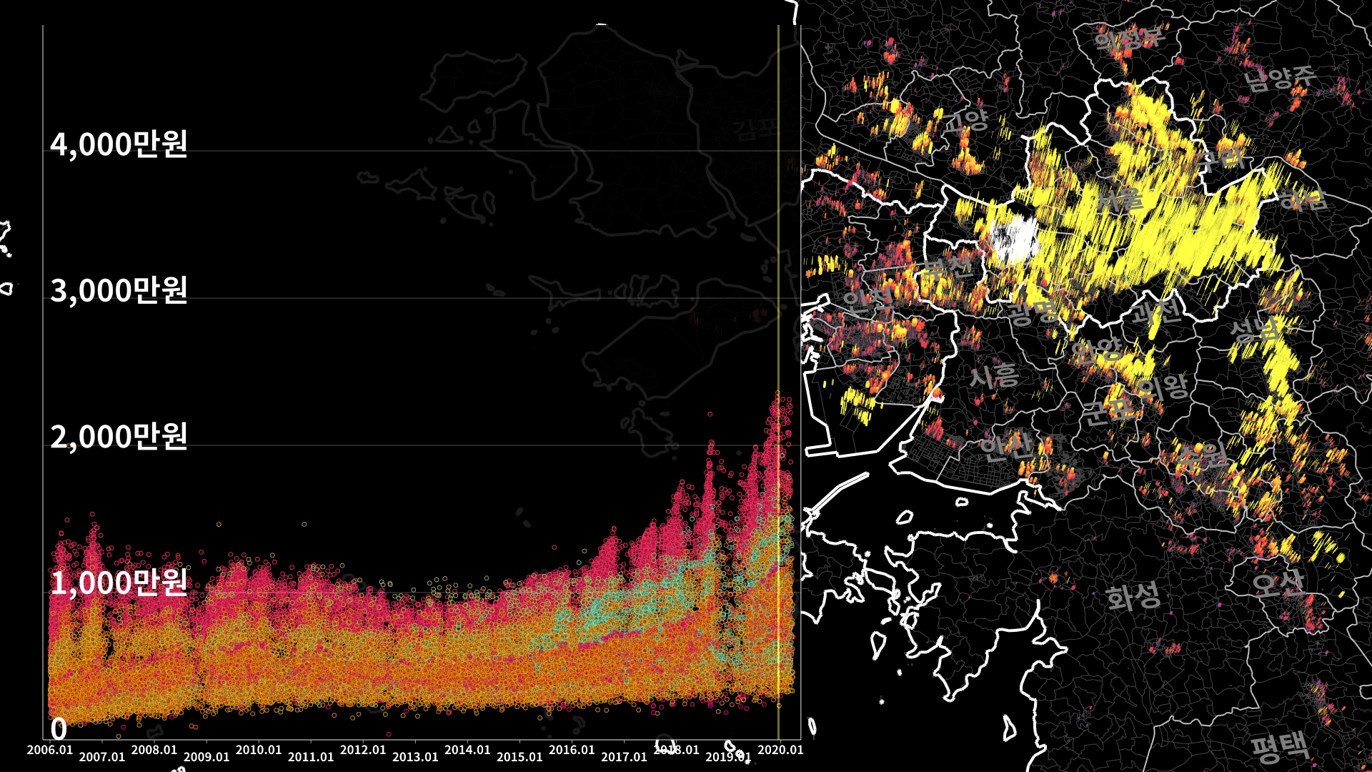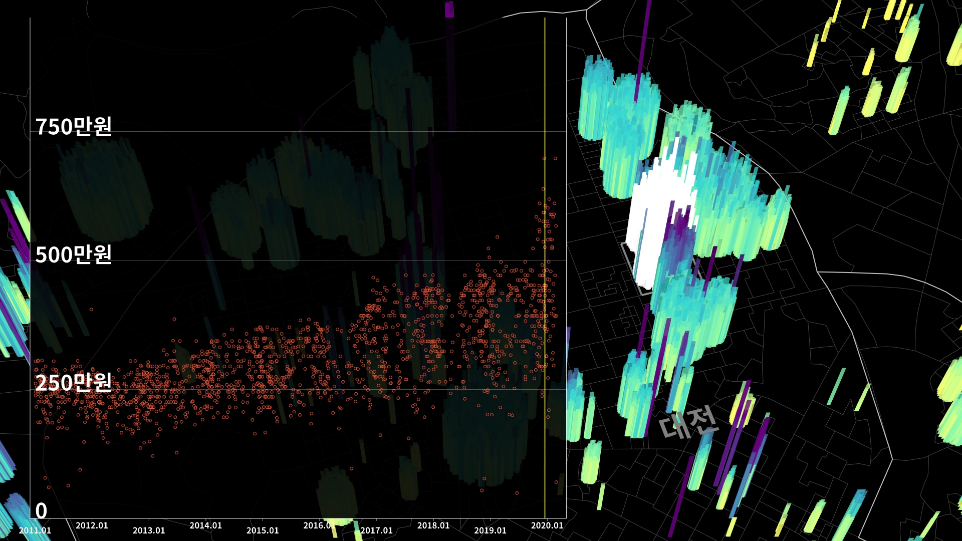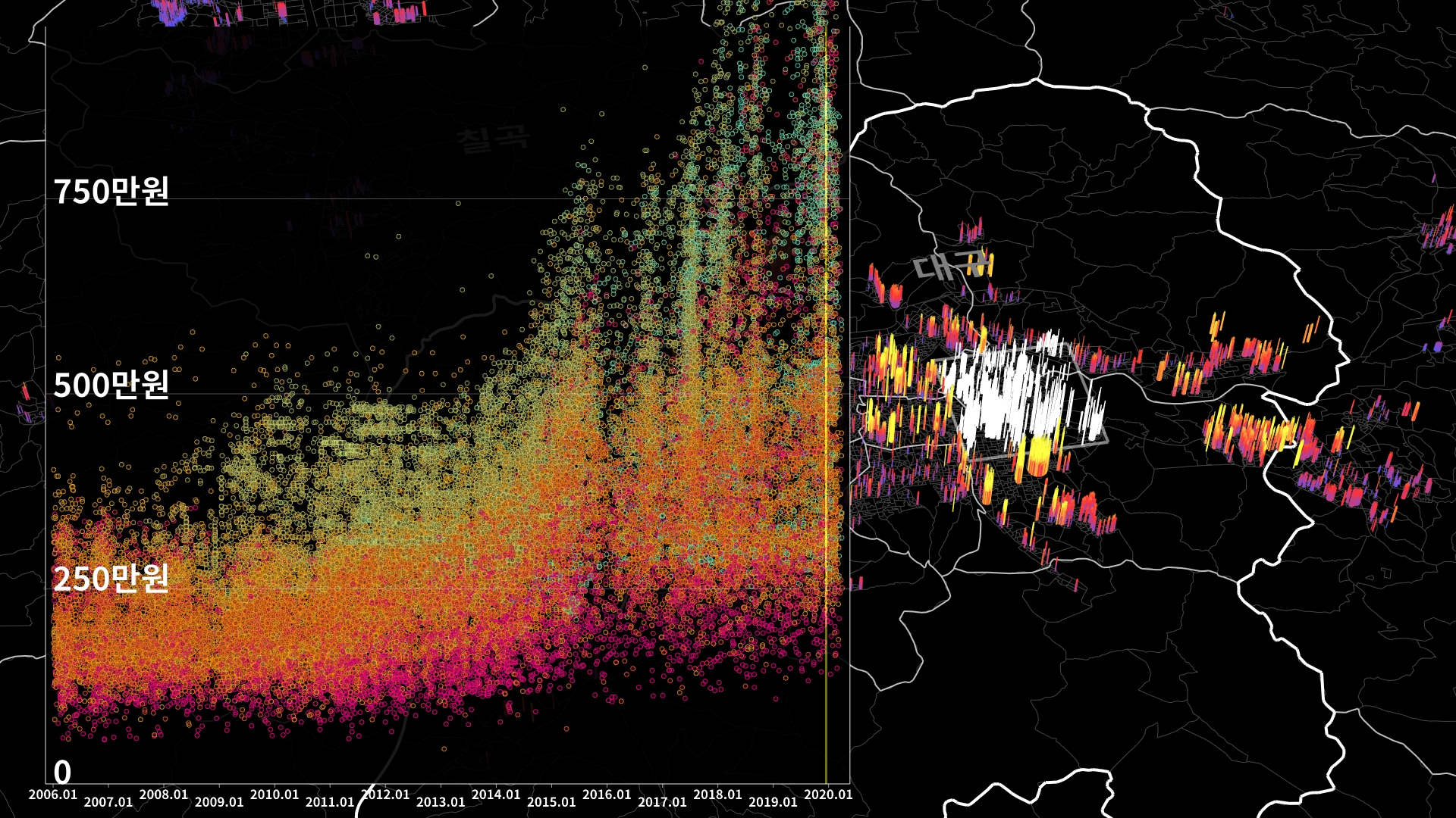 붉은색은 1980년경 혹은 그 이전에 완공된 아파트의 실거래건이고, 하늘색 계열로 올수록 2020년 최근에 신축한 아파트의 실거래건이다.