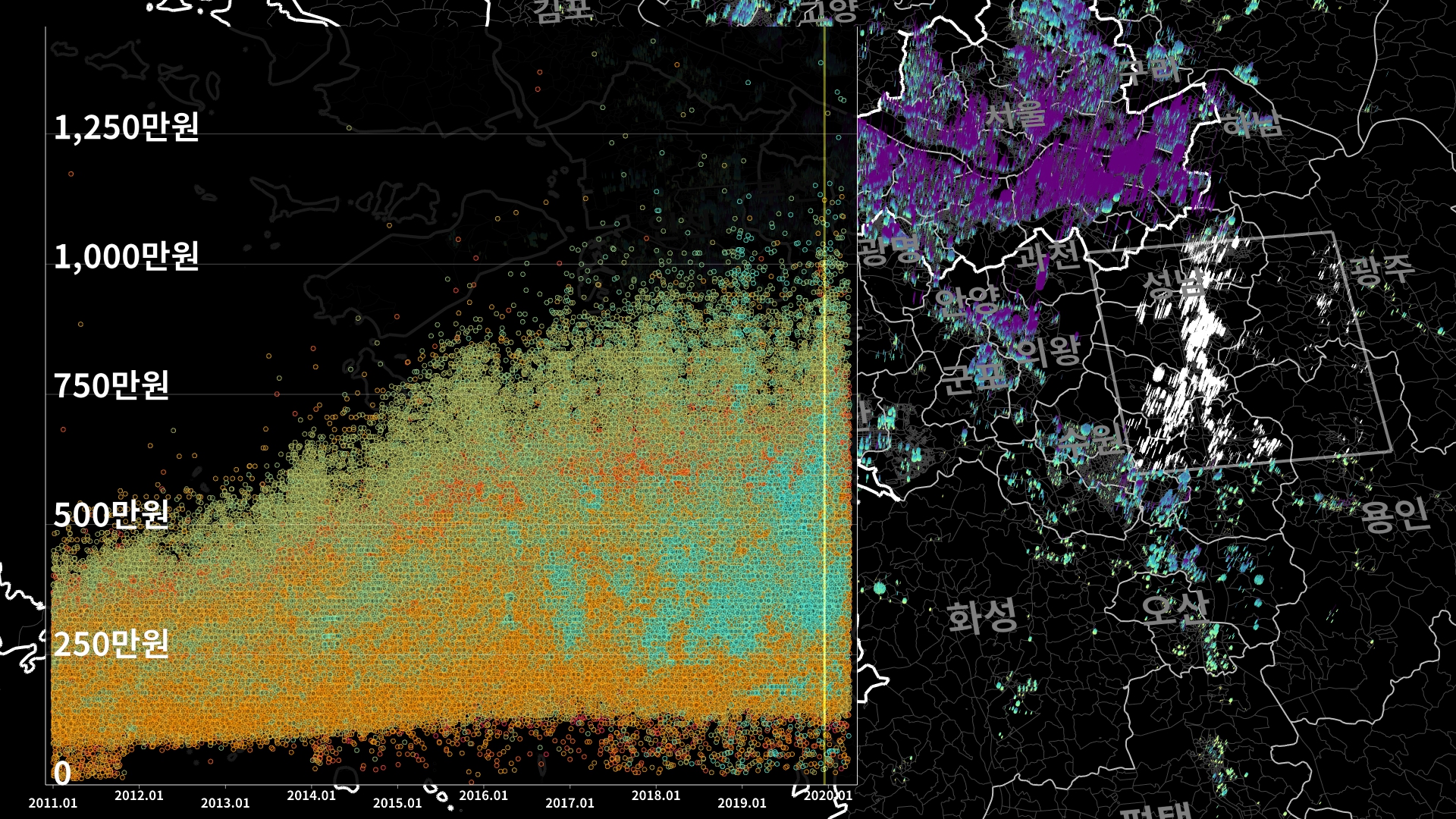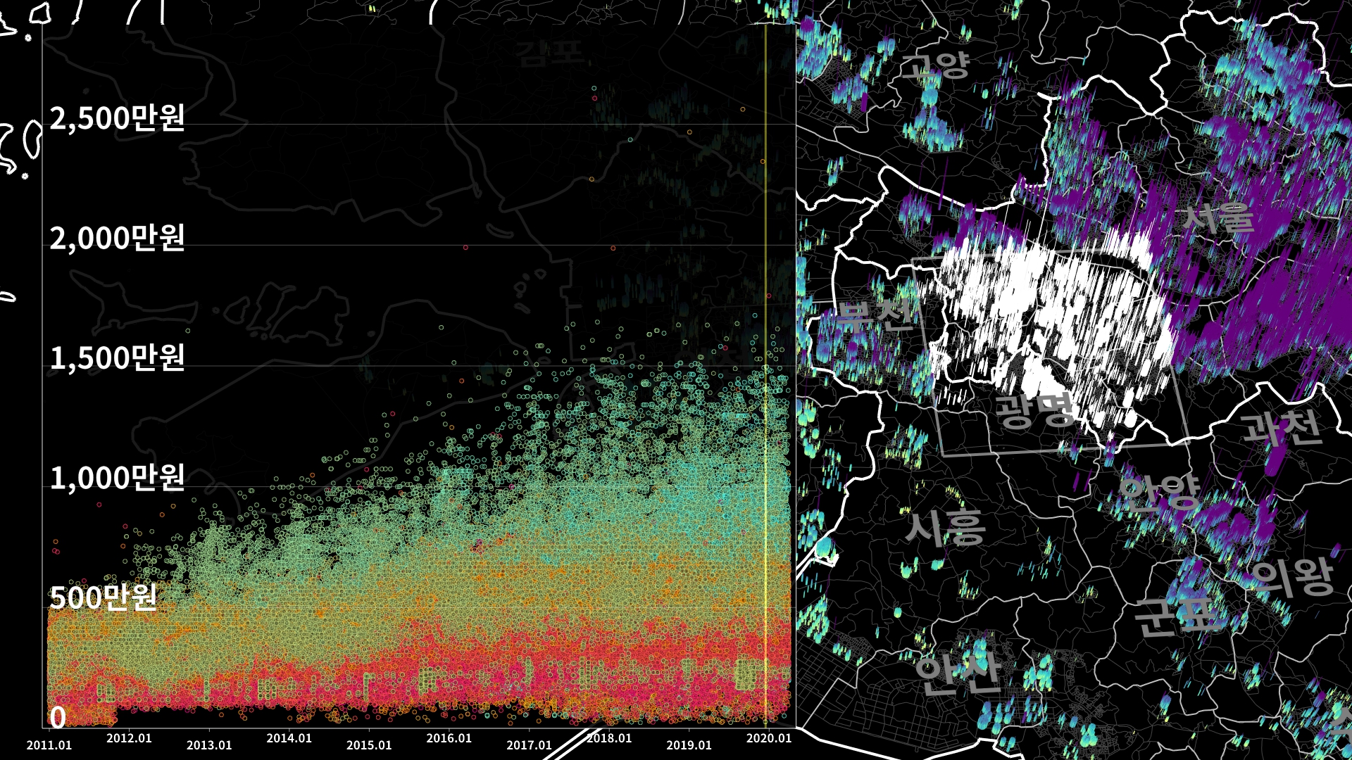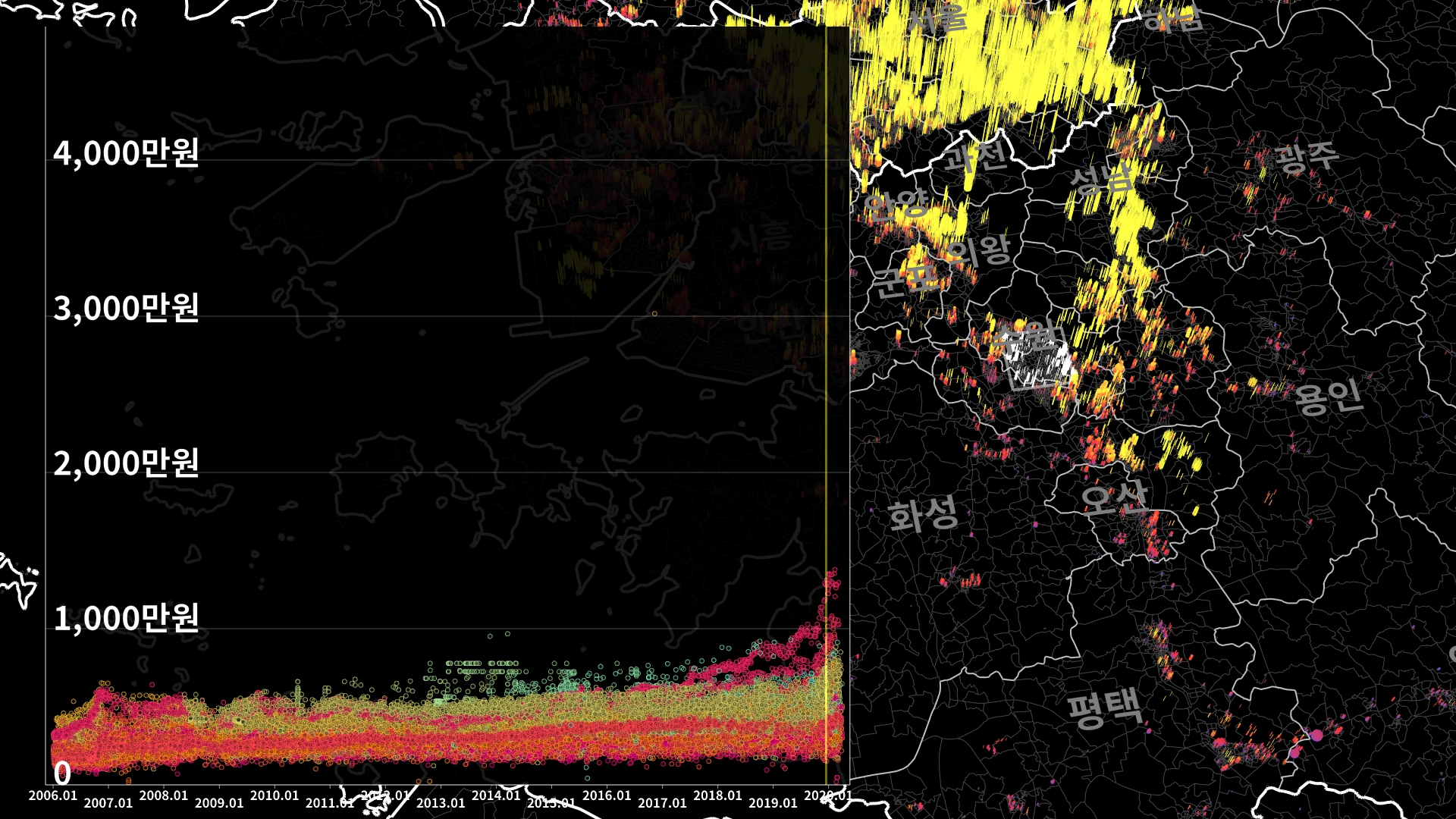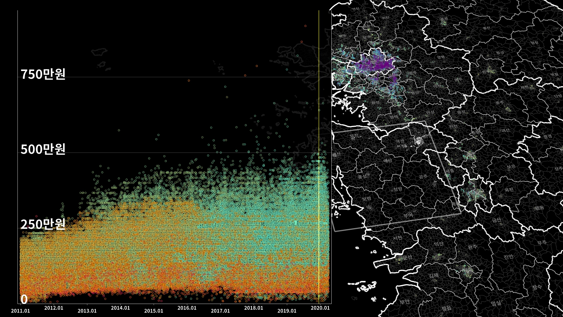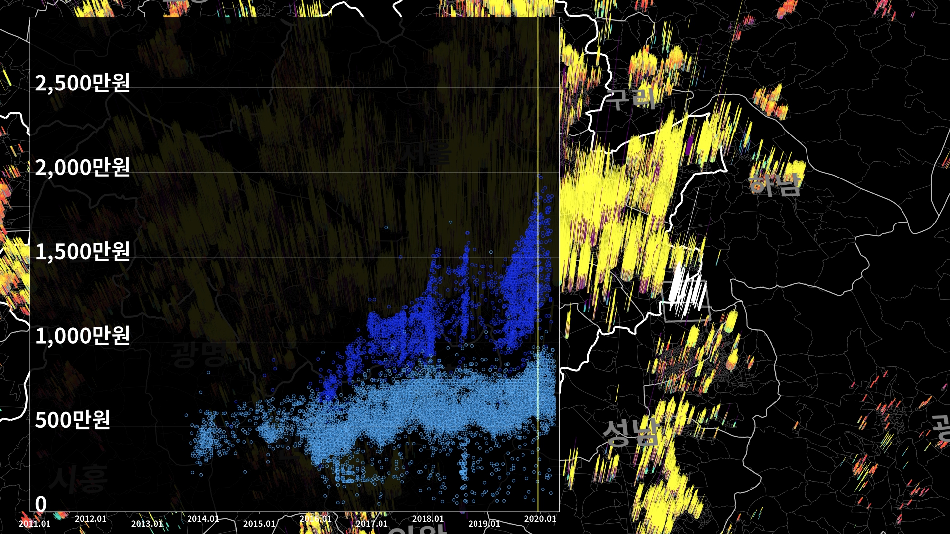 붉은색은 1980년경 혹은 그 이전에 완공된 아파트의 실거래건이고, 하늘색 계열로 올수록 2020년 최근에 신축한 아파트의 실거래건이다.