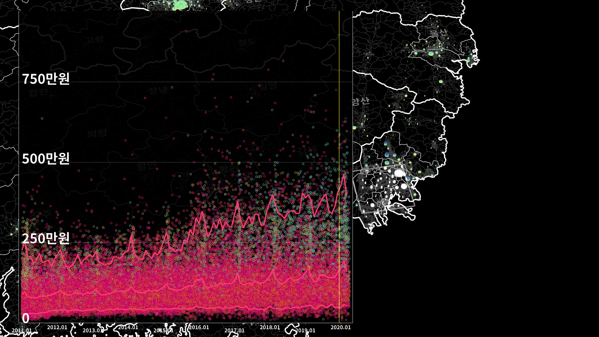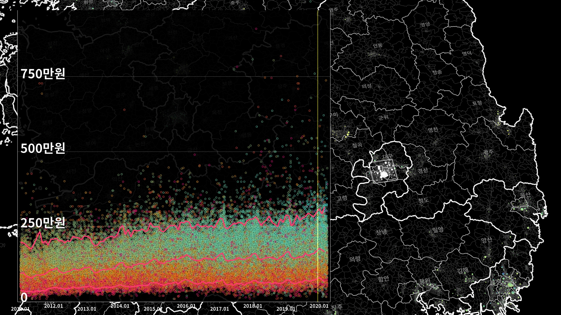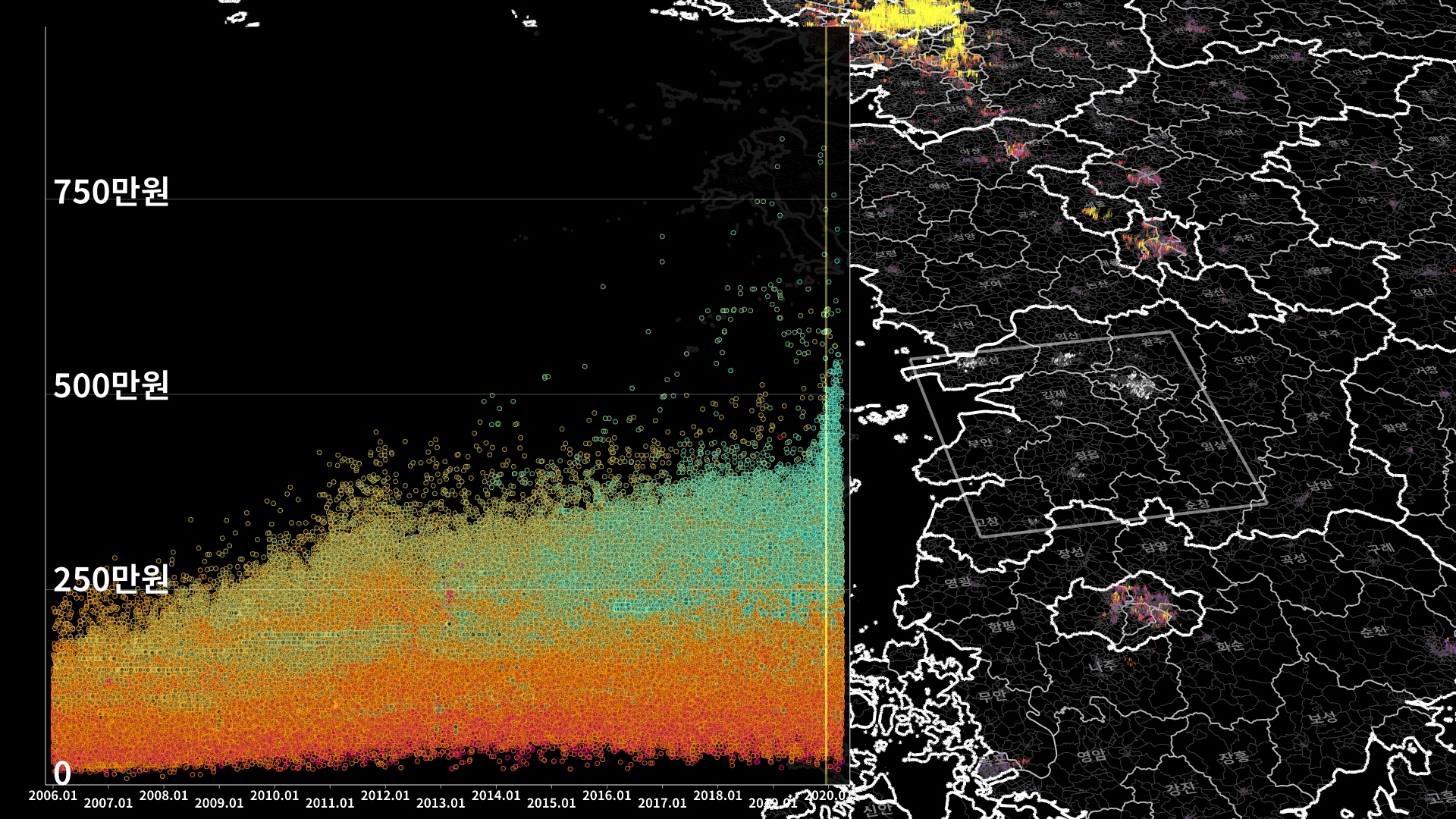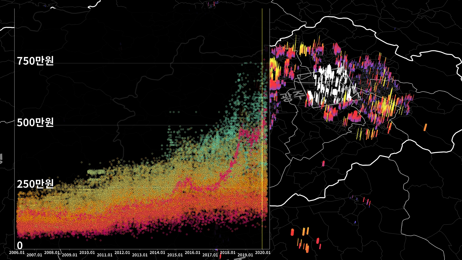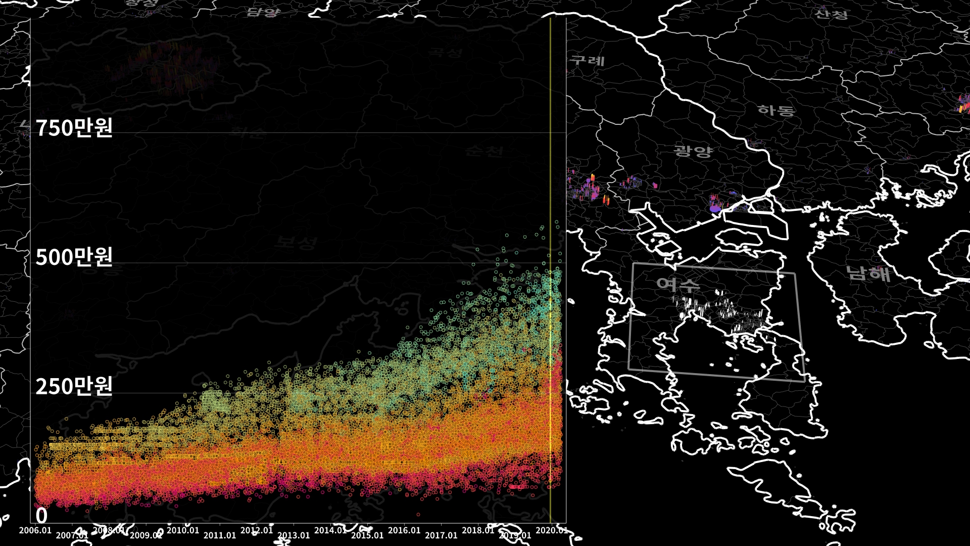 붉은색은 1980년경 혹은 그 이전에 완공된 아파트의 실거래건이고, 하늘색 계열로 올수록 2020년 최근에 신축한 아파트의 실거래건이다.